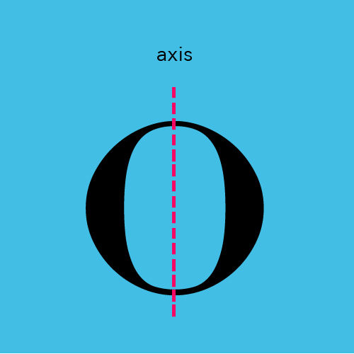 轴线存在于 O 或 d 这样包含字碗的字形里。一款字体中的轴线要统一角度,否则字母看起来就像在跳舞一样。需要注意的是,轴线不总是垂直于基准线的。