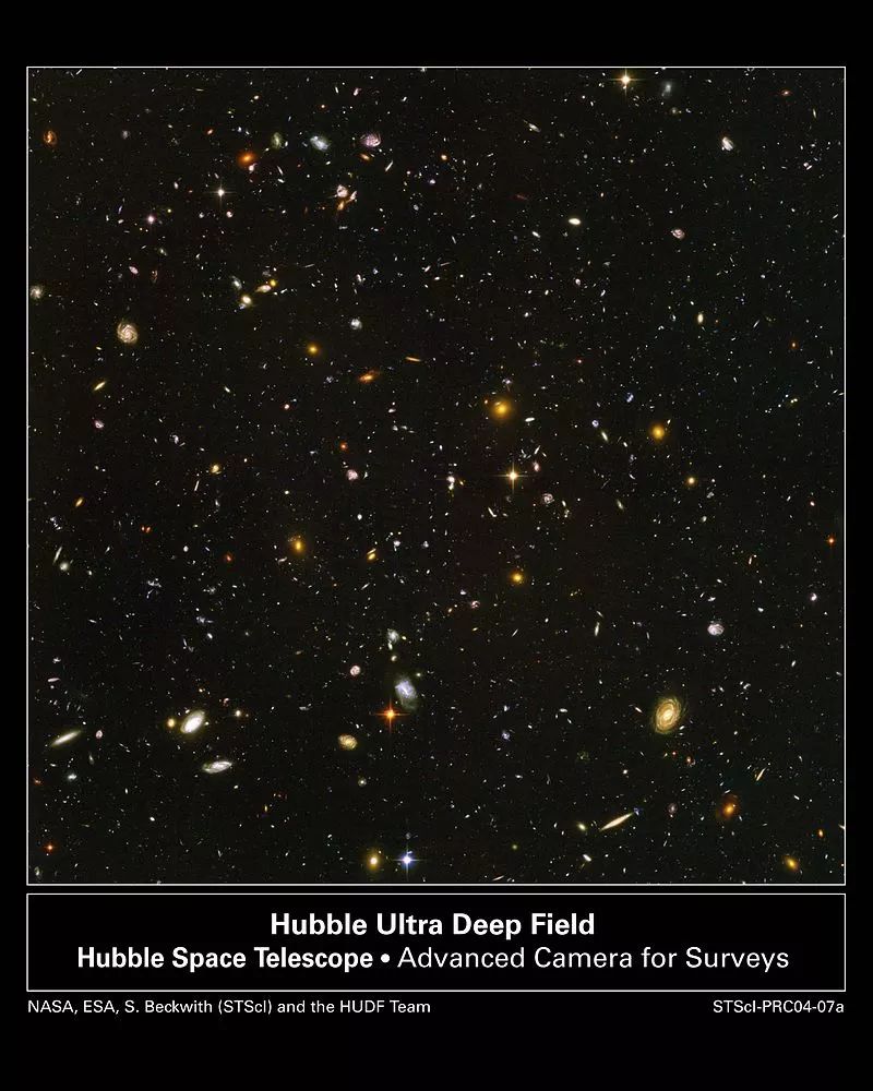 哈勃超深空视场,是天炉座的一小部分,它是截至2006年为止以可见光拍摄的最深远的宇宙影象,显示的是超过130亿年前的情况。来源:维基百科。