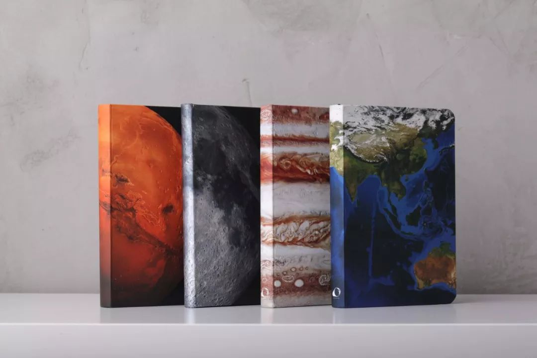 AstroReality星球AR笔记本系列,左起依次为:火星AR笔记本、月球AR笔记本、木星AR笔记本、地球AR笔记本。