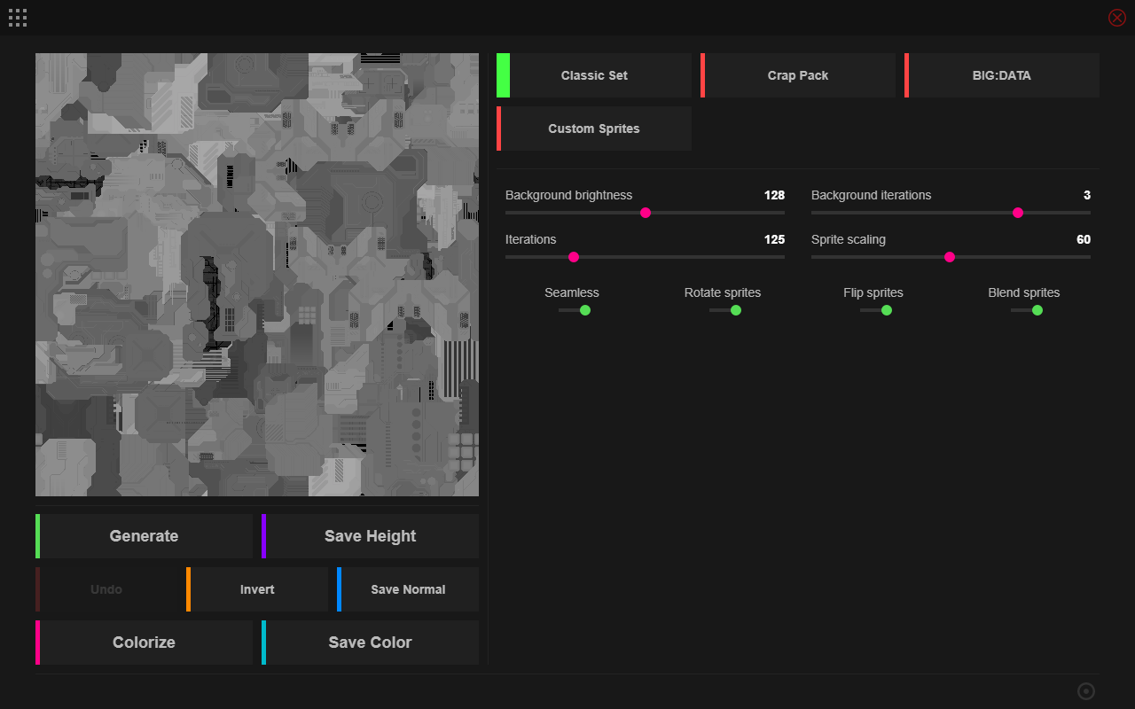 好了,大概介绍了一下这款软件以后开始进入正题吧,如图所示我用了一张Classic的灰度图和法线图,一张电路板效果的灰度图和法线图,以及一张点状和线状的灰度图: