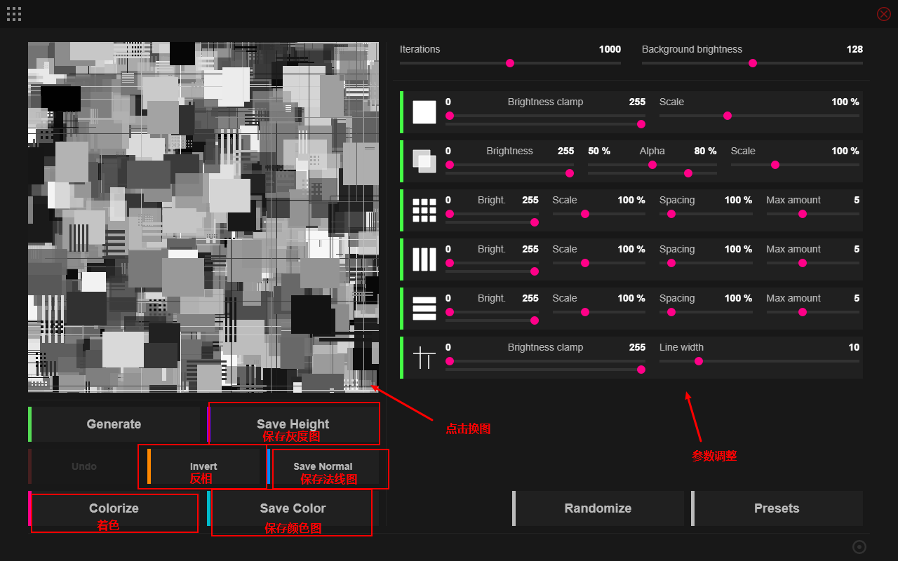 使用方法也很简单,点击贴图显示处就可以随机更换贴图,右边可以进行参数调整。