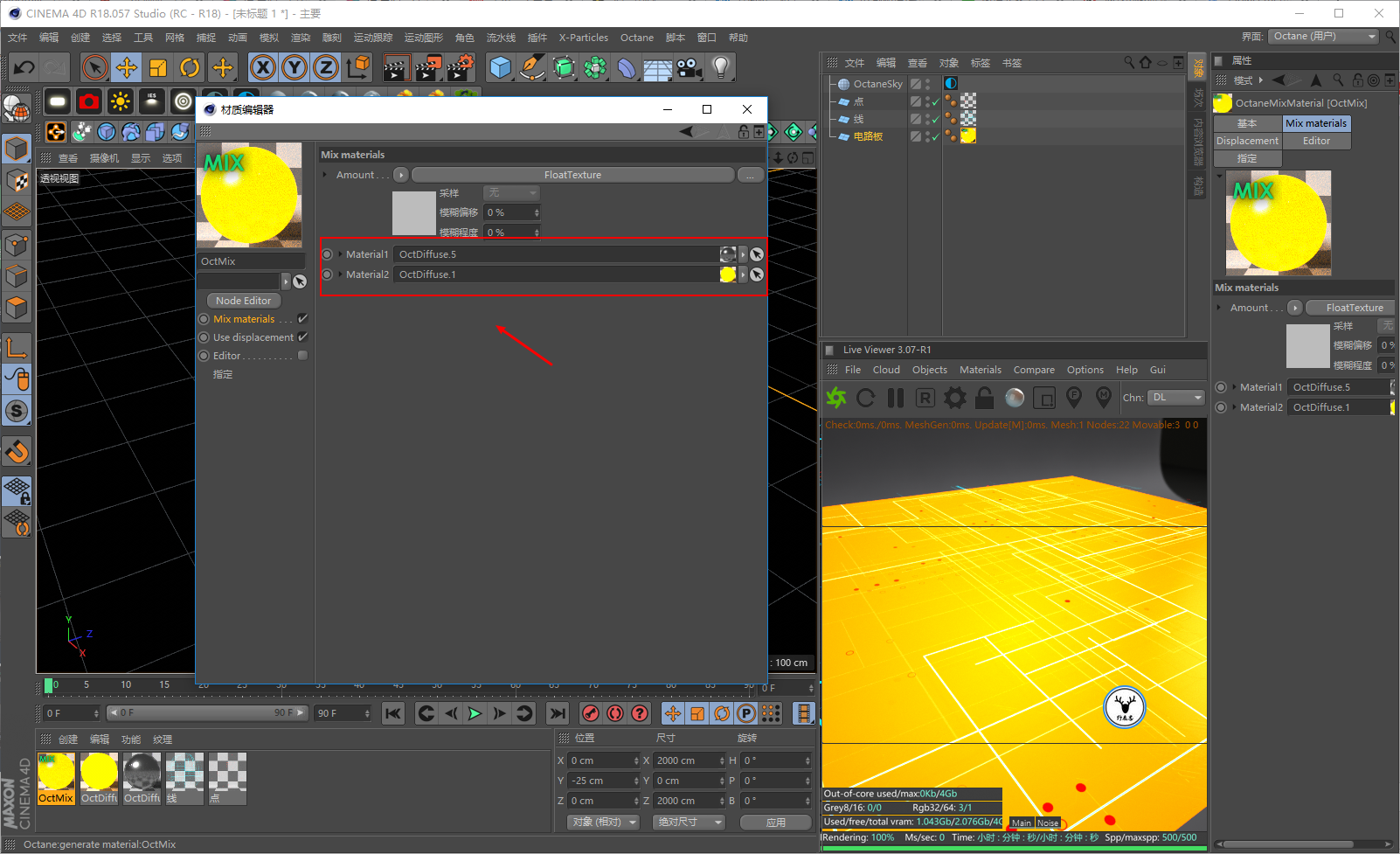 新建一个混合材质,将反射材质和黄色发光材质进行混合: