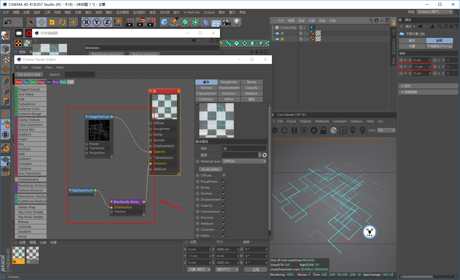 同样的道理在制作一个线状发光的平面,方法一样,记得稍微改变一下Y轴上的位置,这样点和线才能都显示出来: