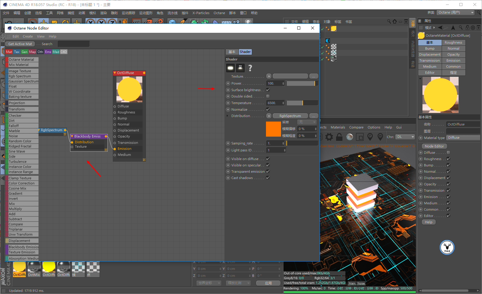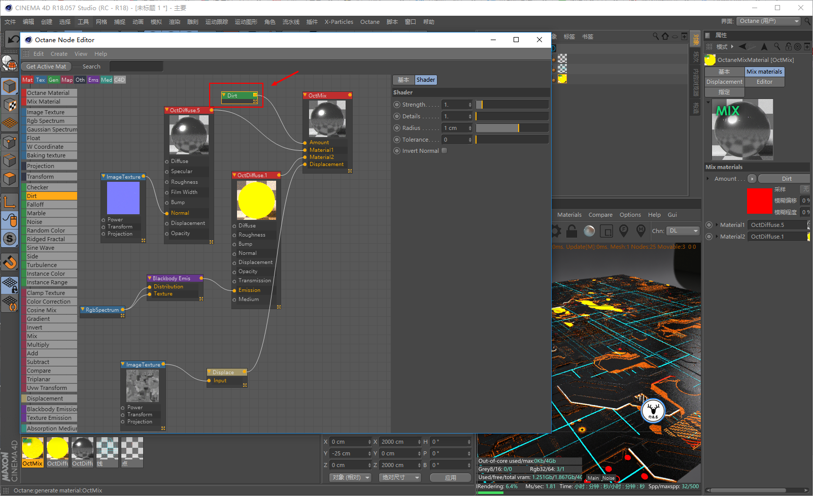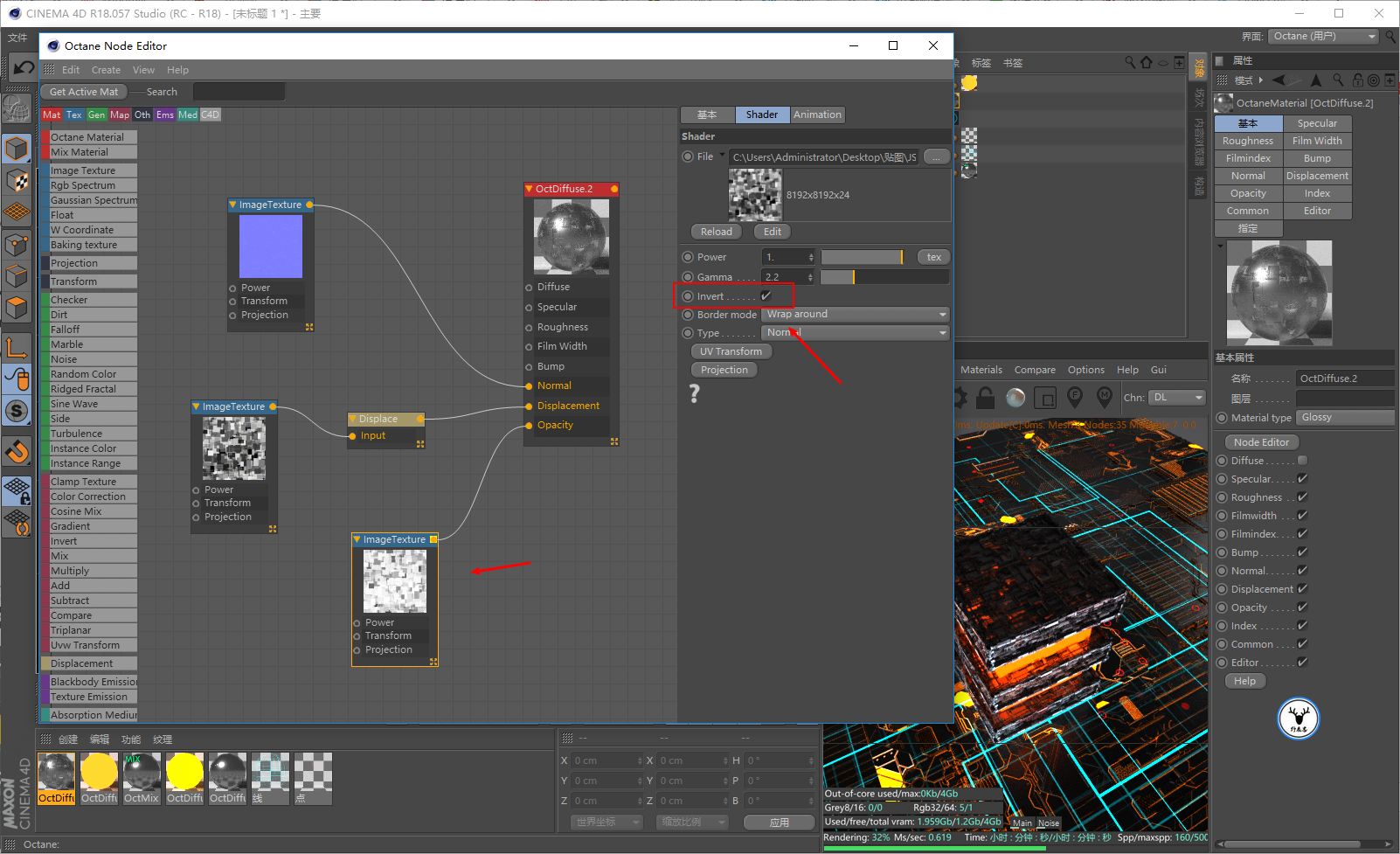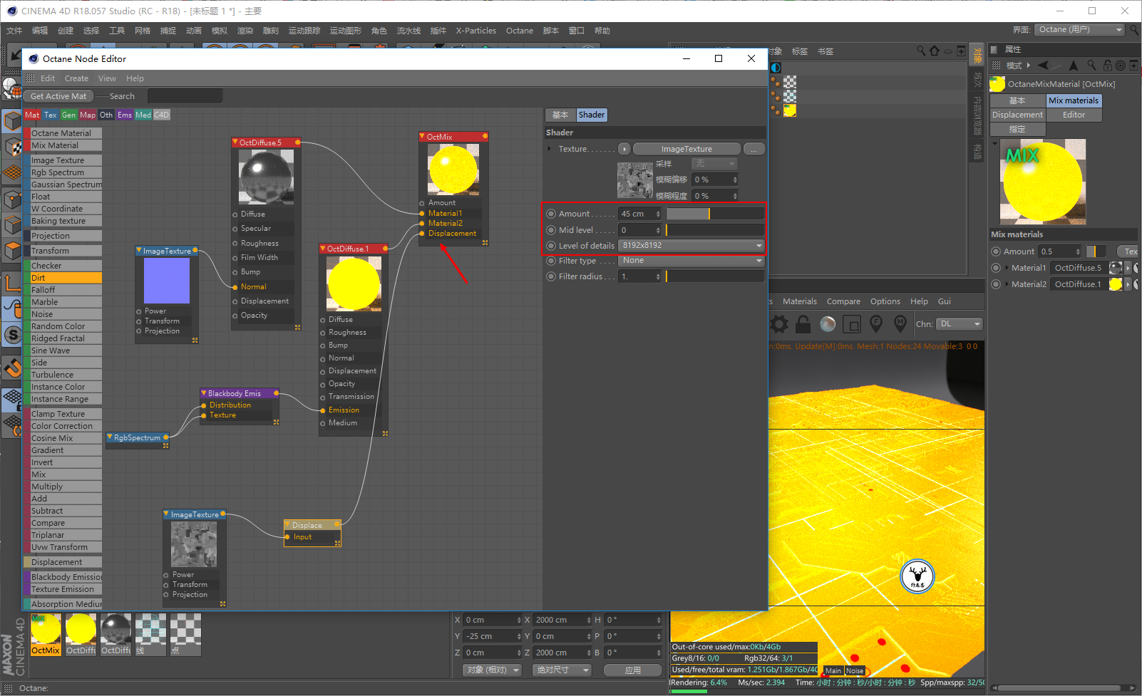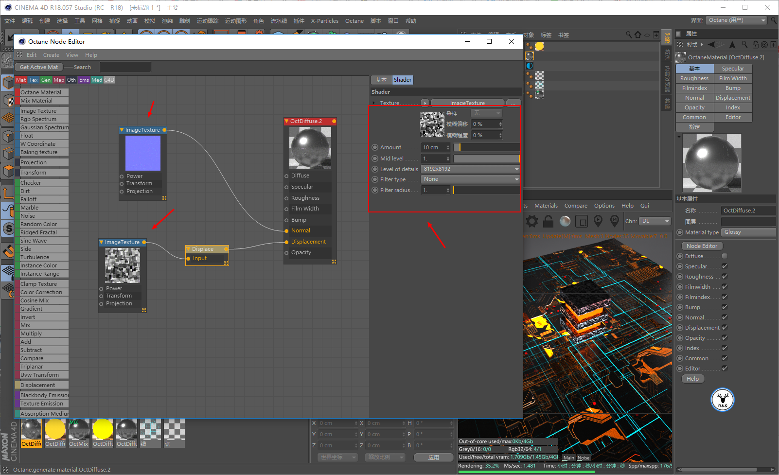 进入节点编辑器,把电路板的灰度图贴给混合材质的Displacement通道,高度的参数可以适当大一点,记得把精度选择为8K哦,这样细节会更好: