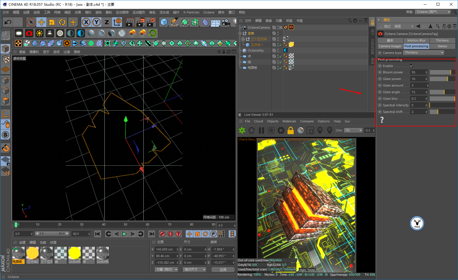 然后中间的立方体我做了一个偏橙色一点的发光: