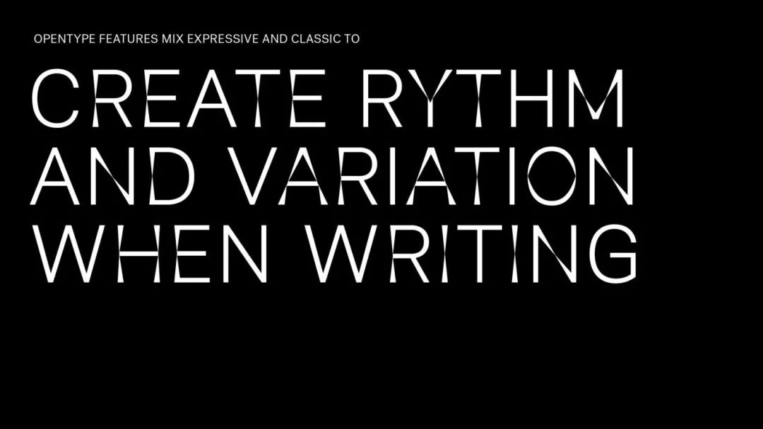 通过Opentype功能,在每个单词中混合了Classic和Expressive两种字体,这产生了一种新的有些怪诞的字体。这种字体具有明显的表现力、对比度和节奏感。