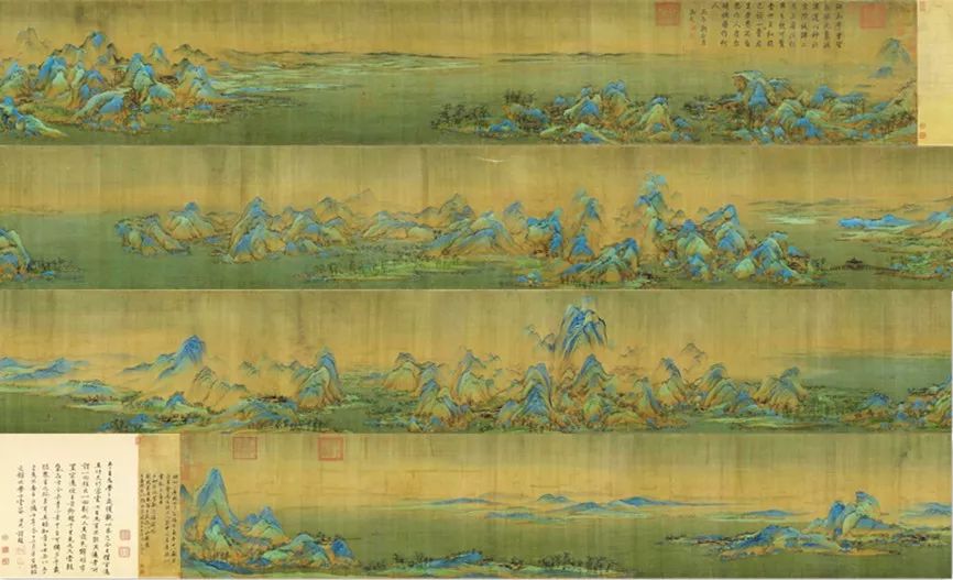 在《千里江山图》中,王希孟以绿色为主色调,描绘出了宋朝的锦绣江山: