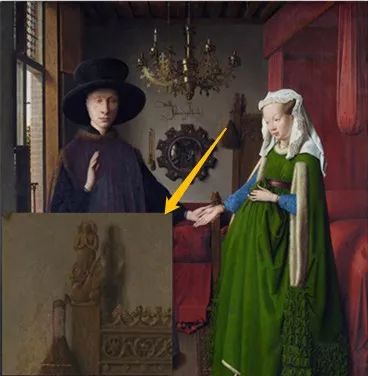 再结合新娘微隆的腹部,和背景中床架上刻着的保佑怀孕妇女的圣玛格丽特雕像来看,新娘很有可能是怀孕了。(也有说法是裙子的样式就是这样)