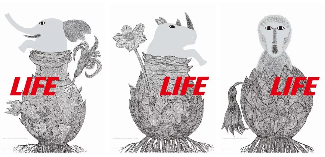 最初的「LIFE」系列海报并不是这种毛茸茸的风格的。下图是1998在东京国立现代美术馆所举办动「LIFE」海报展的一张。