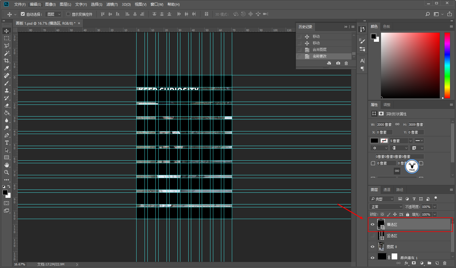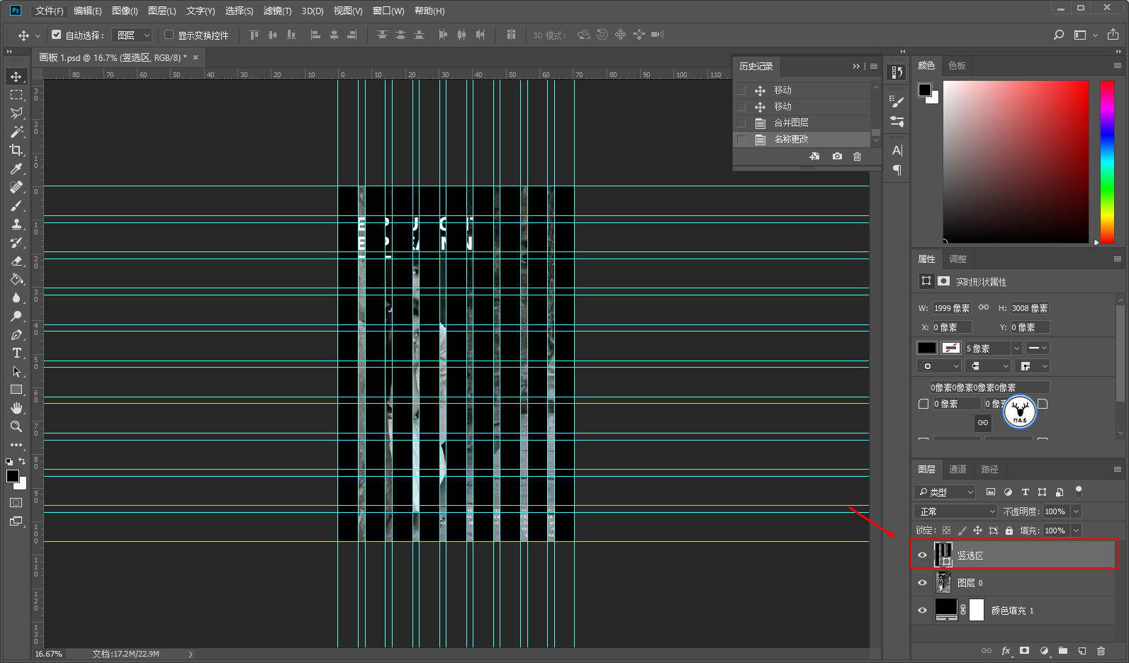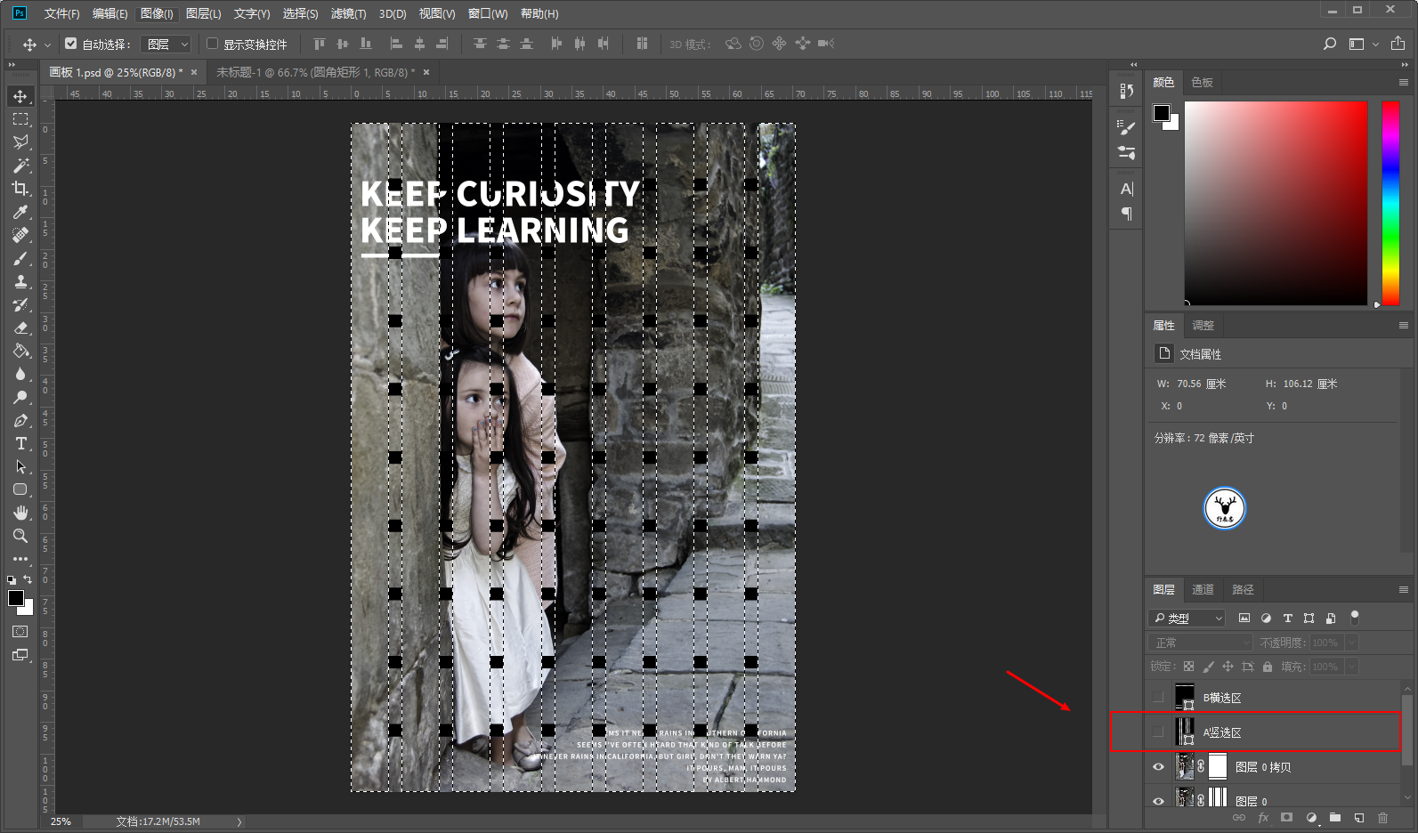 如图所示,我们先按住ctrl键鼠标单击A竖选区的图层缩略图载入选区: