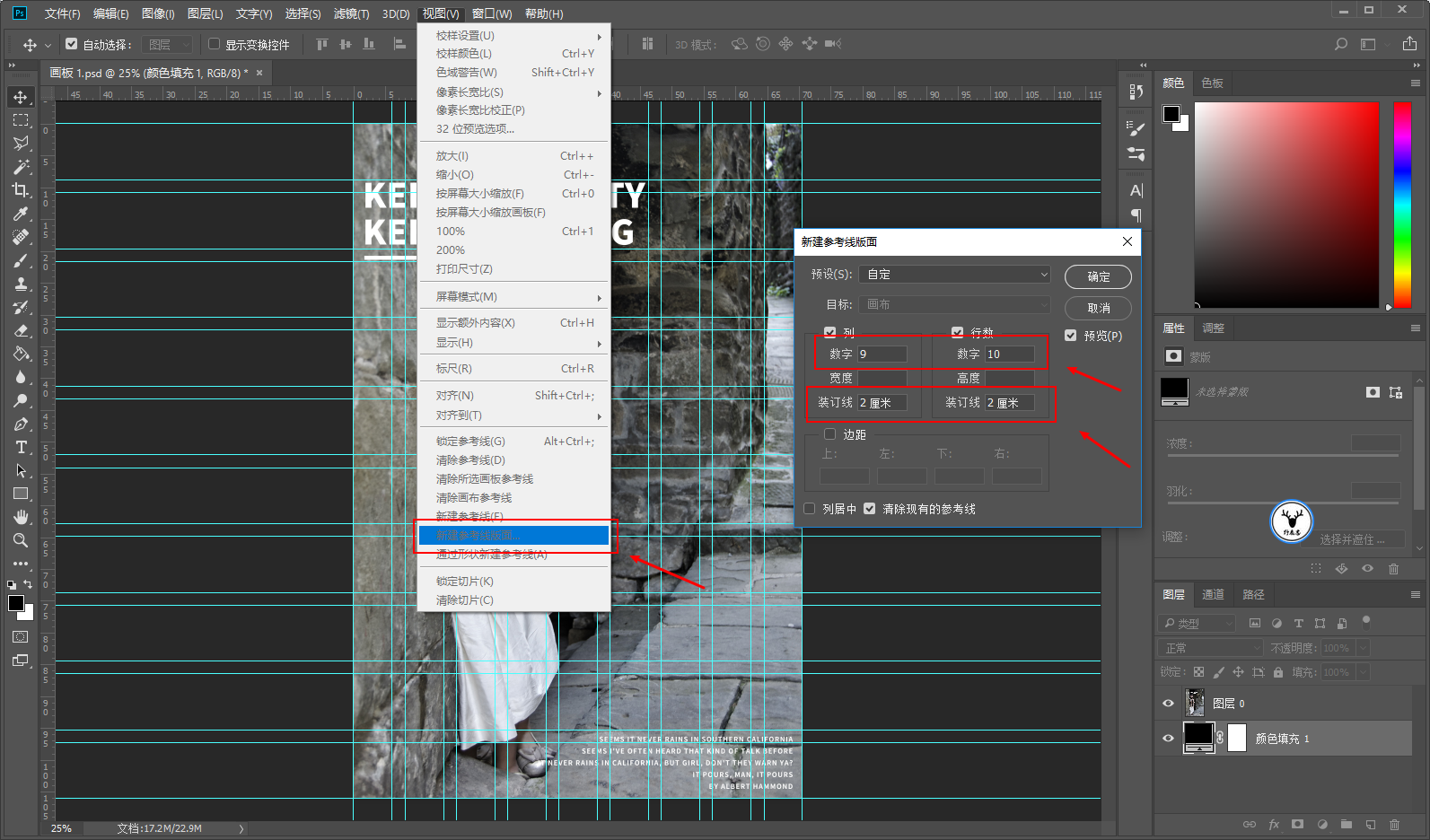 执行窗口-新建参考线面板,这一步可以帮助我们更加准确的建立选区,至于参数大家凭感觉来吧:
