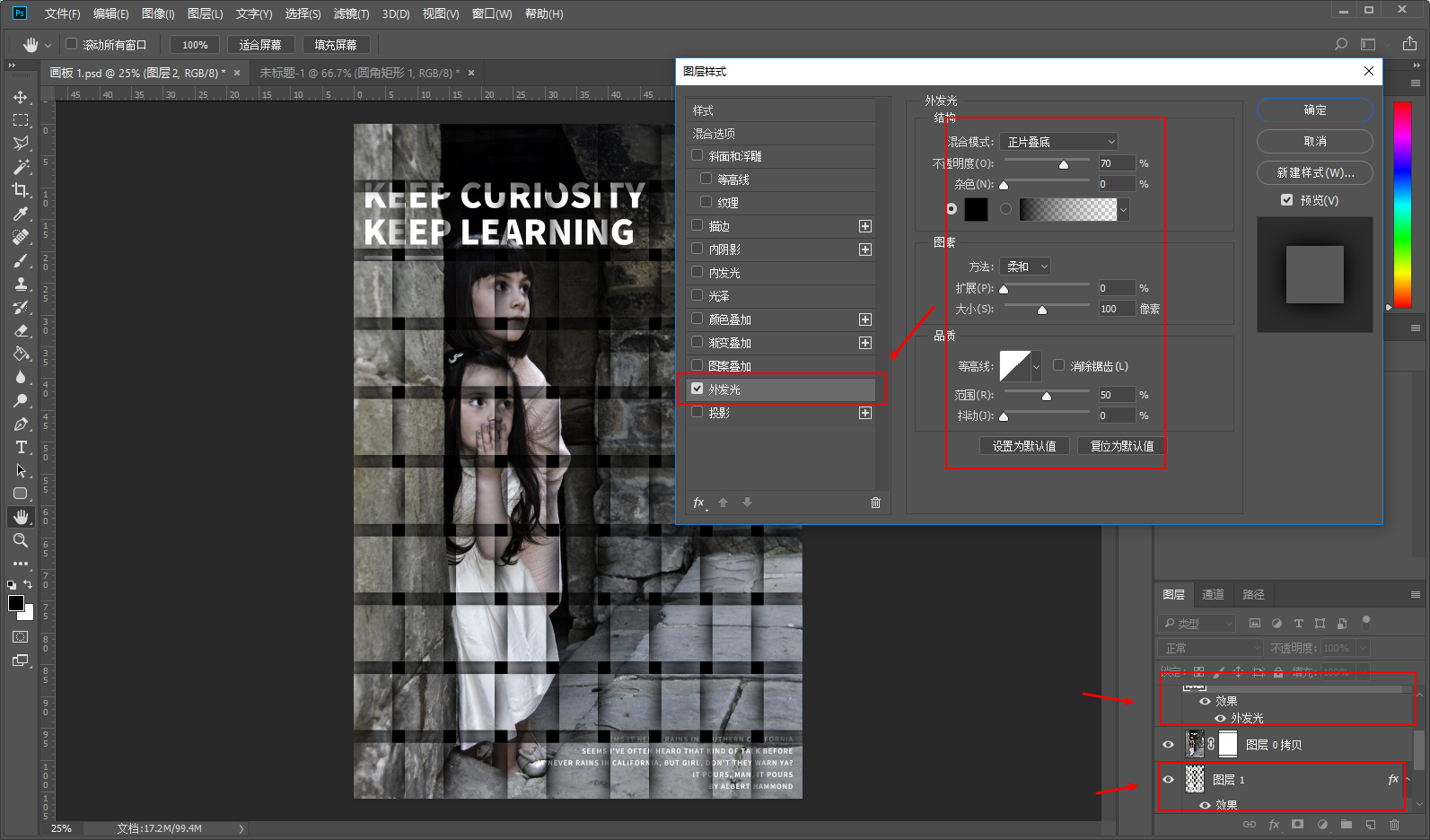 接下来就简单了,给这两个图层分别添加一个黑色的外发光,参数大家看着效果来就好: