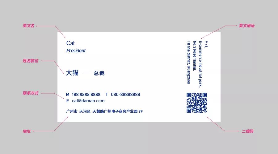 我们再来看一下这组信息,需要用以下信息做一个中英文结合的名片。首先要做的还是把接近性原则处理好,把姓名职位、英文名、联系方式、地址等通过接近性原则划分为不同的组合。