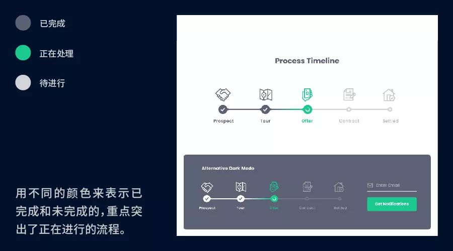 此例中用不同的色彩使已完成、待进行、正在处理的流程区分开来。而“已完成”的步骤其颜色则是一样的;“未完成”之间的色彩也一致,这正是相似原则的突出运用。