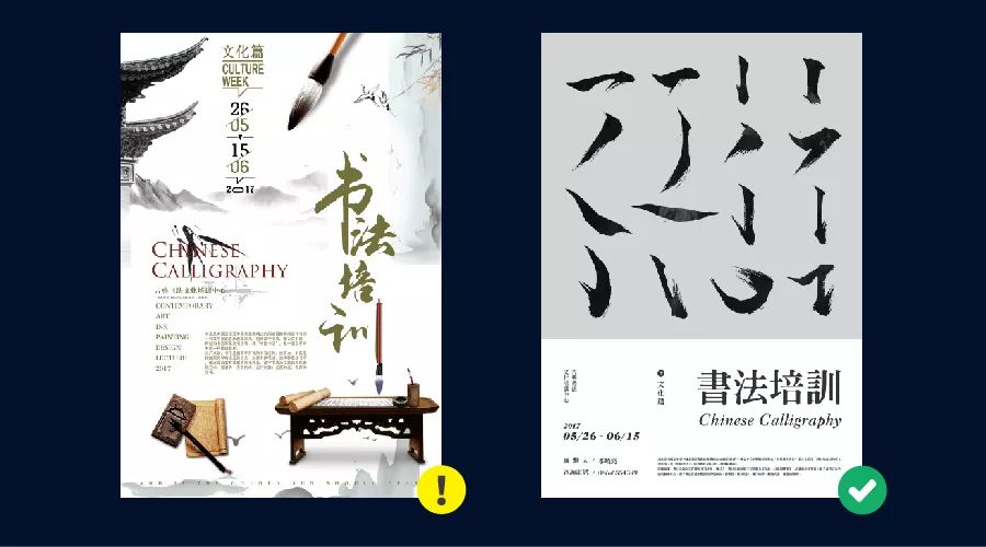 同样是书法培训的海报,左侧的用到太多不相关的元素,庙宇、竹子、山川等等,与主题的契合度不够。而右侧的案例仅仅只用了书法笔触的素材,但契合度和表现力却比左侧好很多。另外右侧文字的编排在接近性、连续性上也比左侧案例好很多。