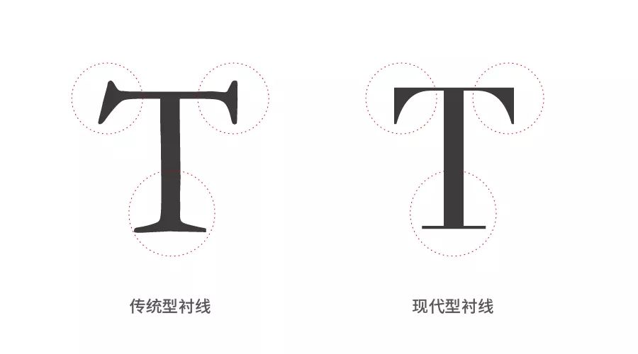 左侧传统型衬线体粗细对比相差比较小,衬线也比较圆润复杂,衬线连接处呈圆角;右侧现代型衬线体粗细对比相差非常大,衬线连接处呈直角,简单直接,。