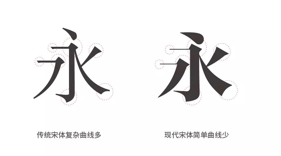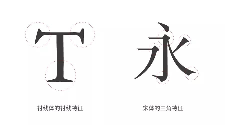 既然衬线体分为传统衬线与现代衬线,那么宋体也是一样。按照宋体装饰三角的复杂程度也可分为传统宋体与现代宋体。