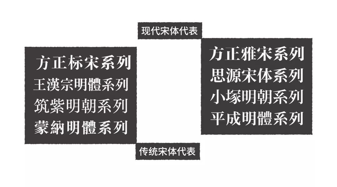 常用的传统宋体有方正标宋、书宋、报宋、筑紫明朝、王汉宗明体等;而常用的现代宋体有方正雅宋系列、思源宋体、小塚明朝等。