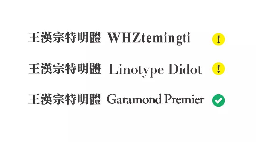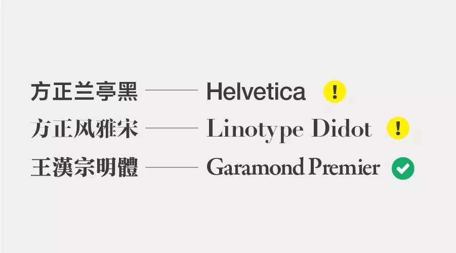 第一组搭配为方正风雅宋与其自带的英文,显然是不匹配的;第二组为方正风雅宋+Garamond,现代宋体搭配传统衬线体,显得也不伦不类,不和谐;第三组为现代宋体搭配现代衬线Didot,所以非常和谐。