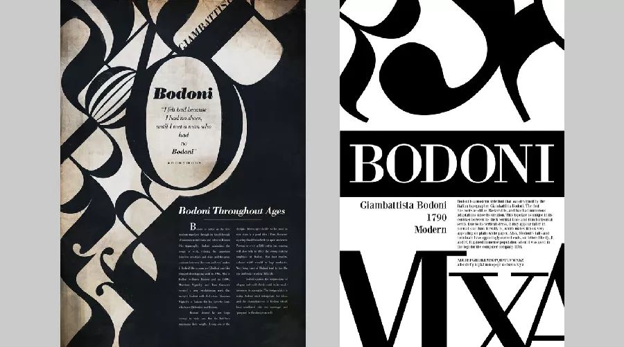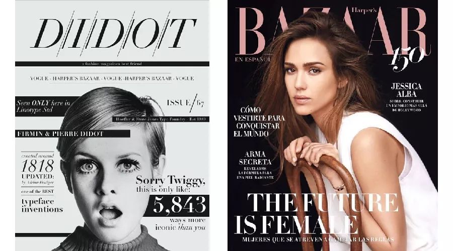 偏现代衬线体的代表有Didot、Bodoni、Walbaum等。他们在保留衬线的同时又有很强的现代感,粗细对比也比较大,能够传达出优雅、女性、高端、时尚的气质,因此很多时尚杂志、女性产品选择此类型的字体。