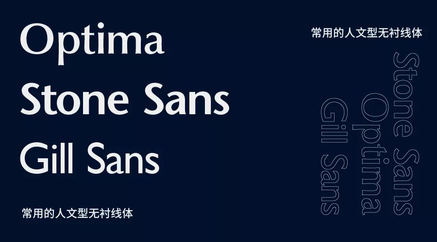 人文型无衬线体的代表为Gill Sans、Optima、Stone Sans等,人文型无衬线体给人感觉是理性与感性并存,是很有温度的一类字体。他们也能传达优雅、秀丽、人文的气质。