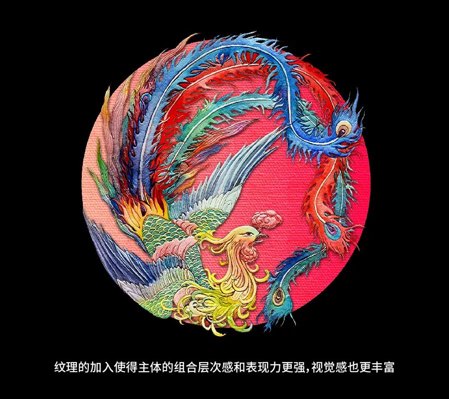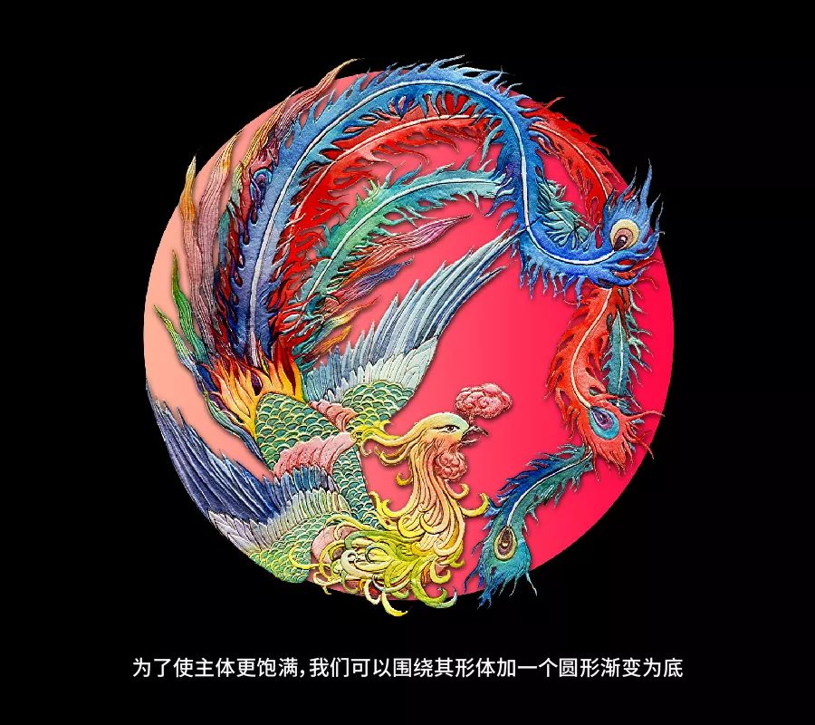 虽然调整好了,但素材的负空间比较多,比较零碎,所以我们可以为他加入一个底,最好贴合着形体来,我这里加了一个渐变的圆形,形式贴近中国特色民族传统工艺之一的刺绣,与活动主题契合不少。
