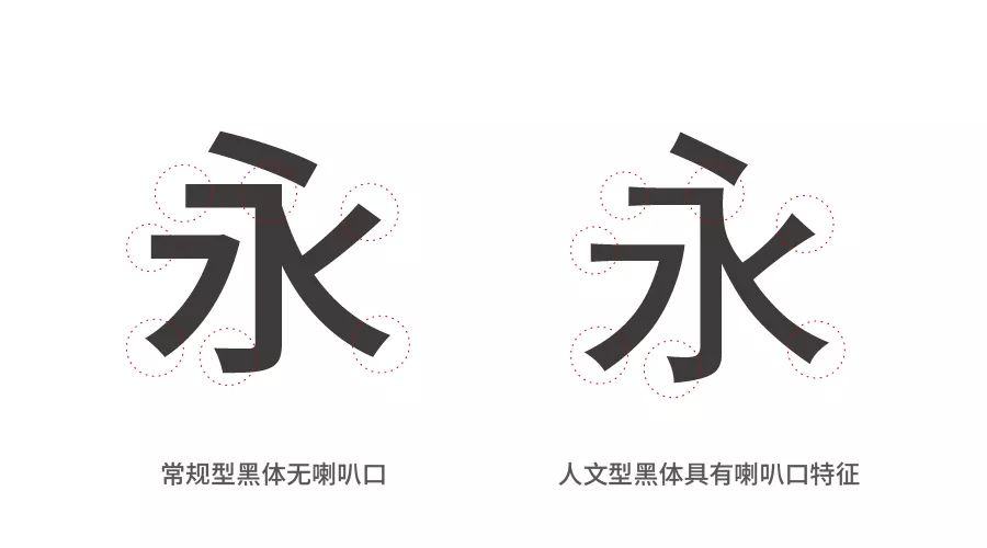 相对于无衬线体,黑体的分类就比较简单了,按照有无喇叭口的原则只将其分为常规型黑体与人文型黑体。无喇叭口的黑体为常规型,有喇叭口的为人文型。