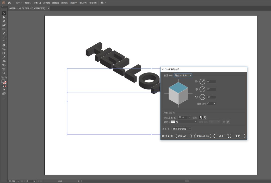 将文本填充成灰色(不然就是糊的哦),然后效果> 3D>凸出和斜角。