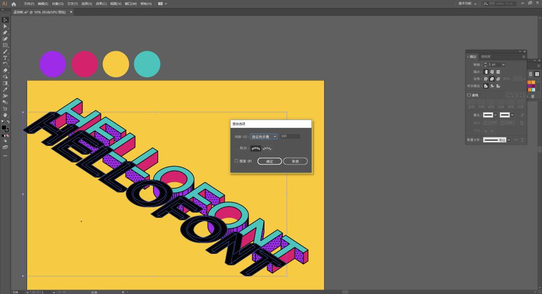 再复制一层,将其轻推到左侧,形成错位,然后对象>混合>建立,在混合选项中,将“间距”更改为“指定的步数”,并增加到100。