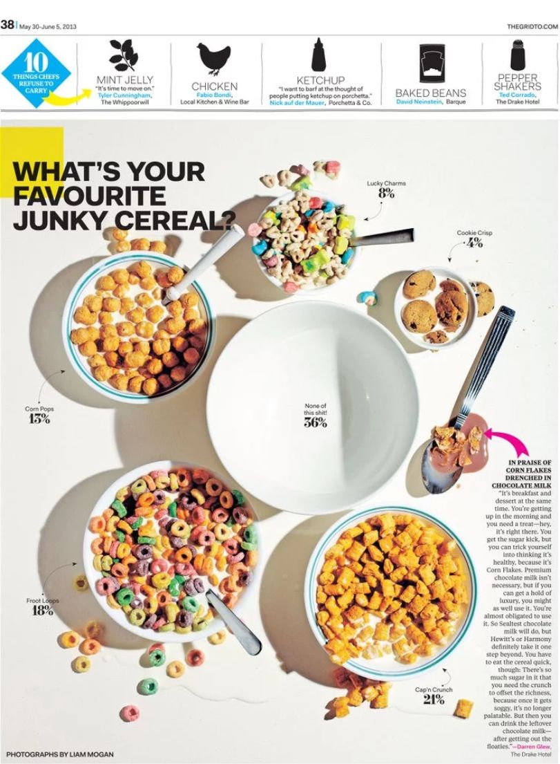 The Grid的设计师用同样方法展现各种谷物早餐的流行程度。