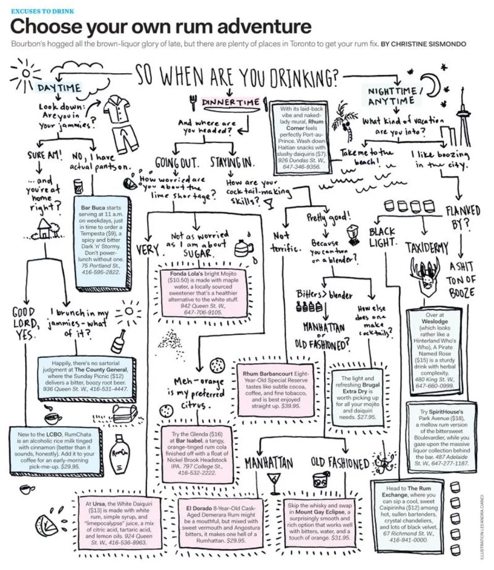 The Grid用手绘图告诉读者在多伦多可以去哪买朗姆酒,如果用纯文字表述想必会很无聊。