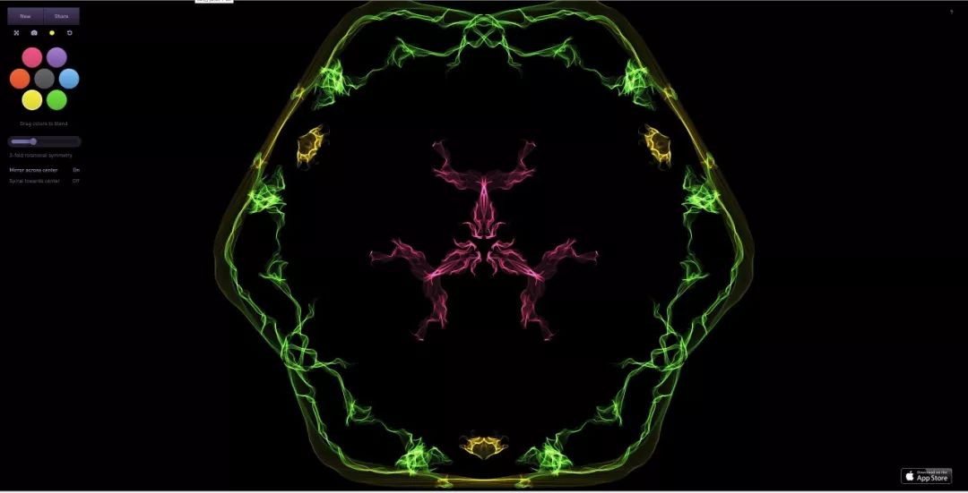 而它的操作面板就更简单了,调渐变只需要勾搭其它色块,下面那个横条是笔触数量,接着是镜像、螺旋开关,毕竟有的人是不需要技能加持,也能画的。