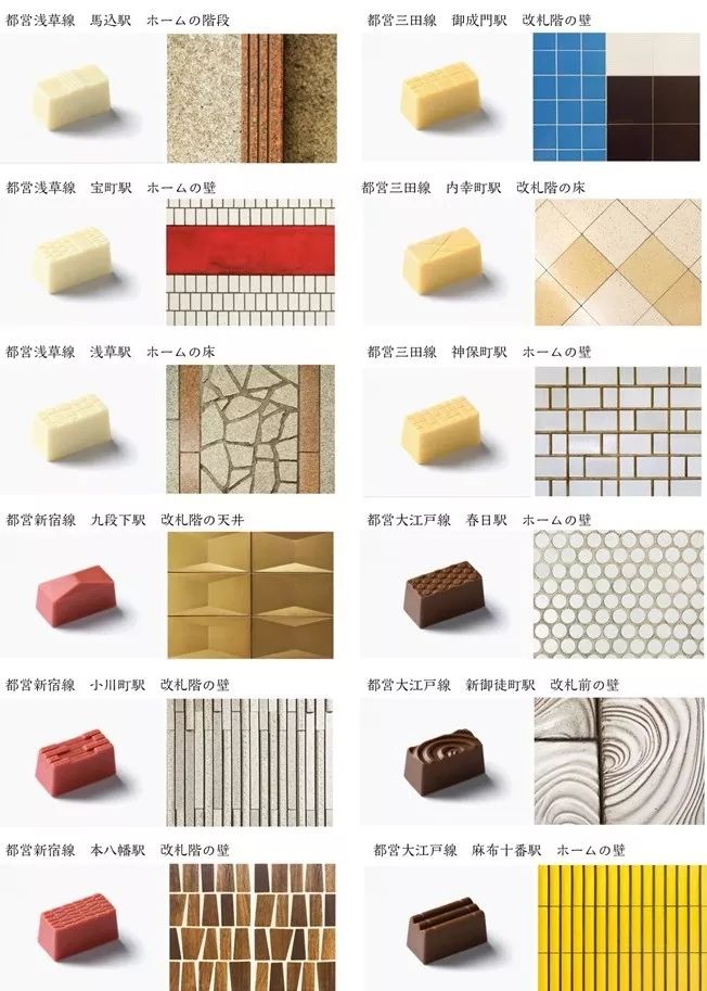 这款巧克力还有正经的法文名字:“Toei Détail”,出自手工巧克力PALET D’OR的主厨三枝俊介之手。每一块巧克力上还精心印上了同地砖一模一样的花纹,丢进嘴里仿佛真的在吃一小块从车站掉下来的砖。