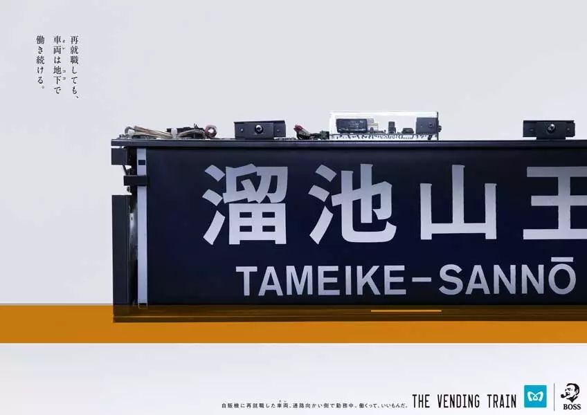 这种很酷的自动贩卖机诞生于罐装咖啡“boss”与东京地铁的联合企划,“退役”了的银座线旧电车被拆下车厢编号和站名显示器,将车厢铁皮重新焊接,组装成了一台带有车型logo和编号的自动贩卖机,变身过程一点也不输变形金刚的酷。