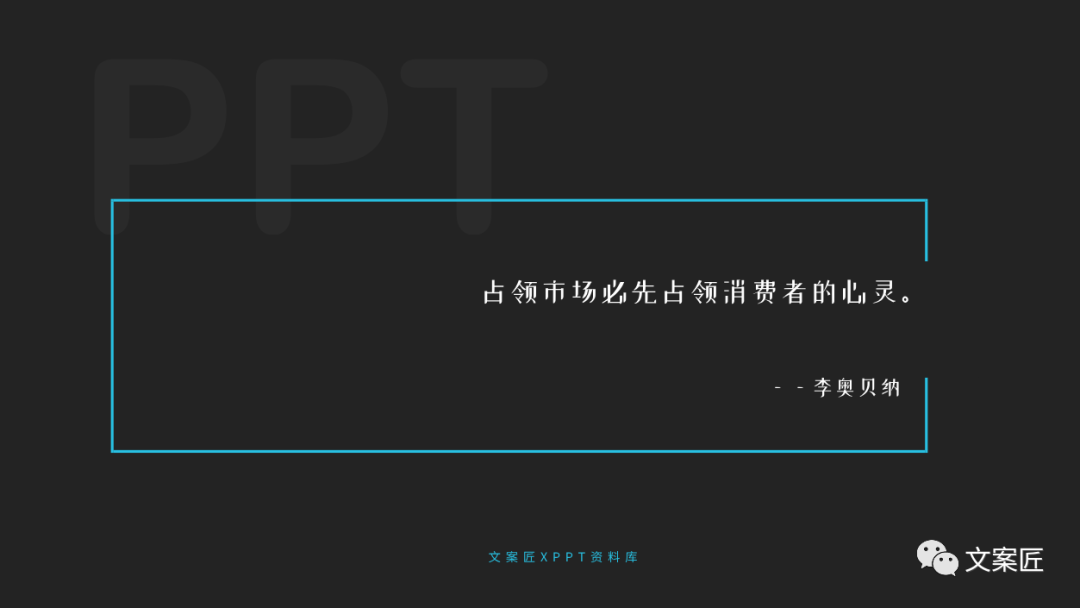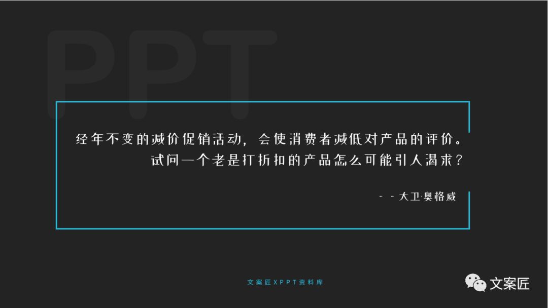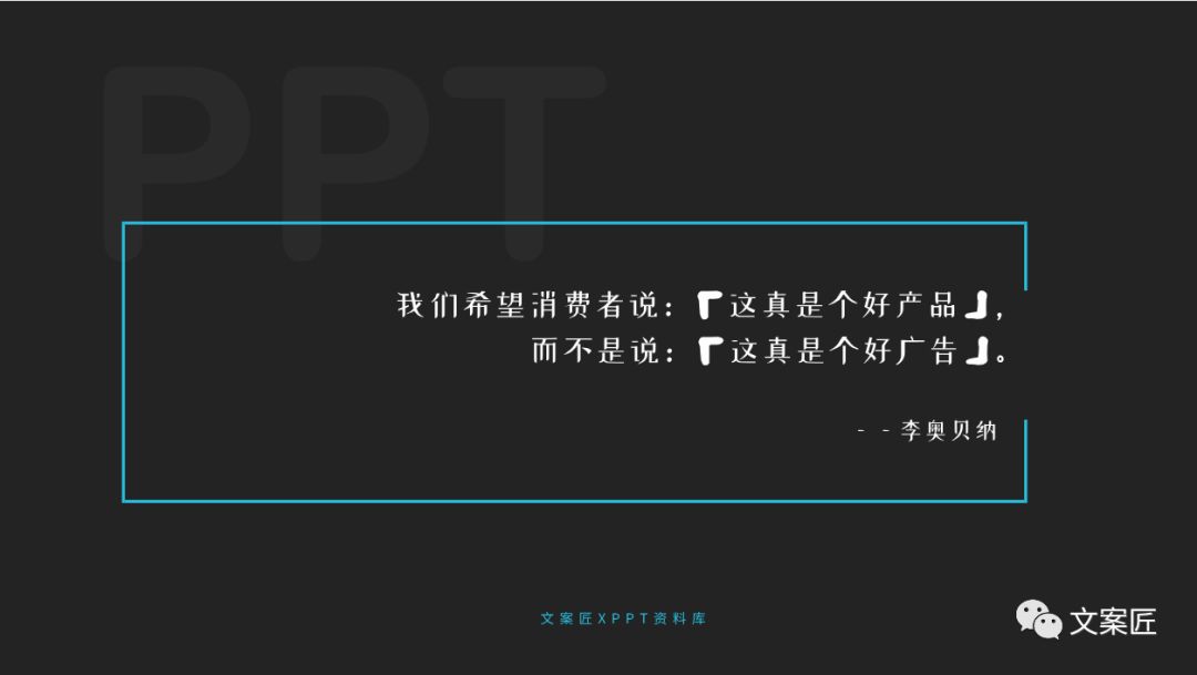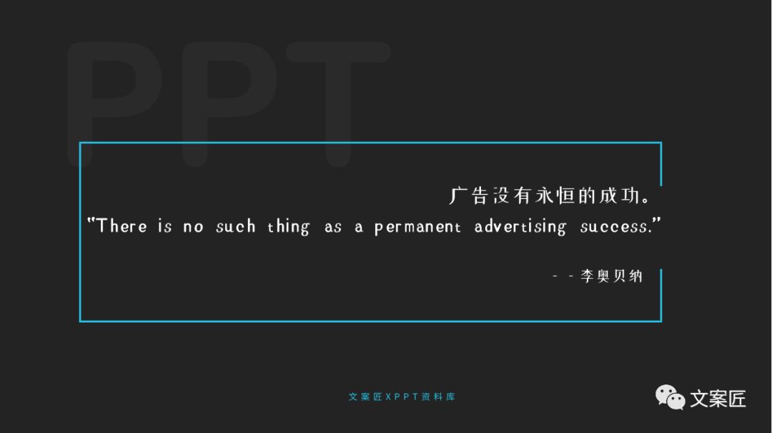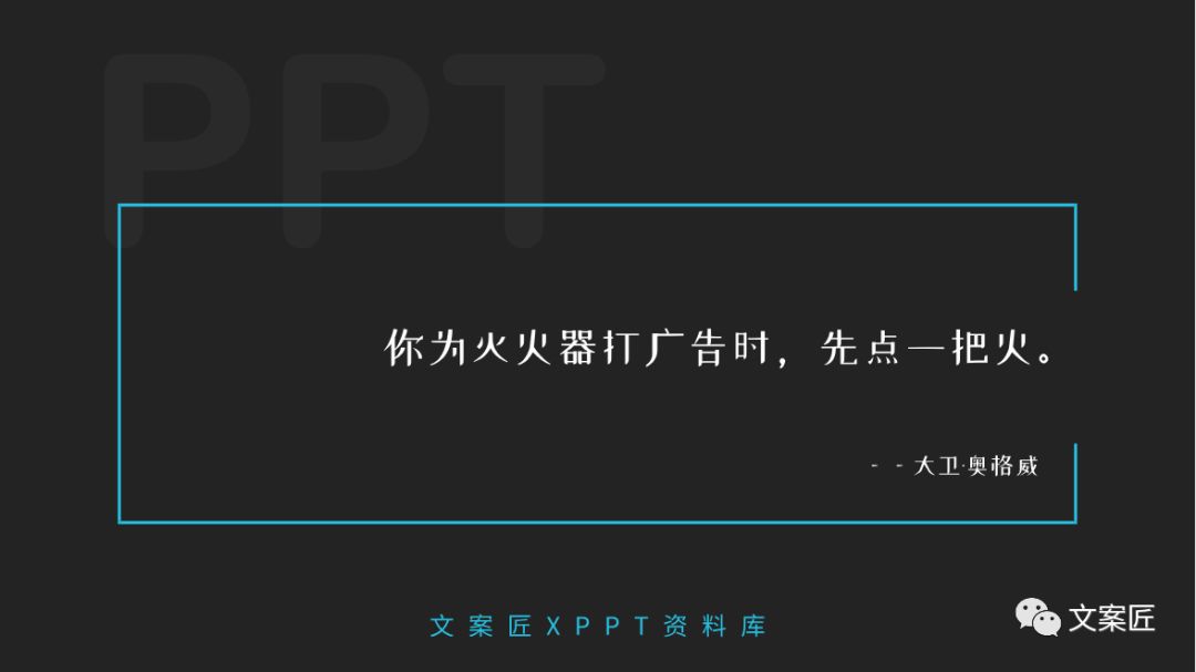 还有一类,能够起到或预告下文或提点前文或衔接前后两部分的经典文案,收藏几条放在自己的资料库中,使用PPT做方案时能够择选合适的作为开场或中间过渡或结尾,也可以为方案点亮不少。