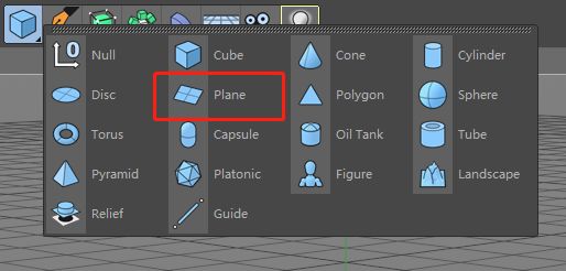 在C4D界面中找到这个蓝色的方块图标,按住鼠标左键会出现二级菜单,找到 Plane(平面)图标在场景中创建一个平面。