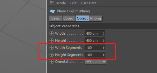 点击刚刚创建的平面,在右下角属性栏中找到Object标签下的width segments和height segments,调节至100,这样做的目的是增加平面上的分段数,使平面在产生形变时不会因为分段数过低而出现锯齿。