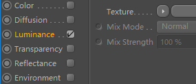 将材质属性中的Color(固有色)与Reflectance(反射)通道后面勾点掉,将Luminance(自发光) 通道勾选上。
