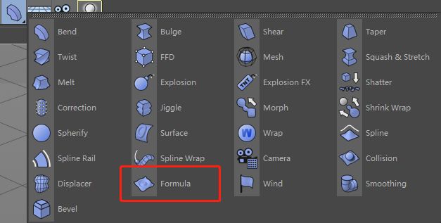 在界面上方的工具栏中找到这个蓝色的弯曲图标,按住鼠标左键会出现二级菜单,找到 Formula(方程式)变形器。