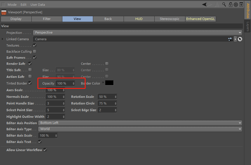 同时按下快捷键Shift+V,在视角设置选项中找到View(视角)选项卡,把Opacity数值开到100%,这样我们就能更清楚的观察最终实际输出的构图。