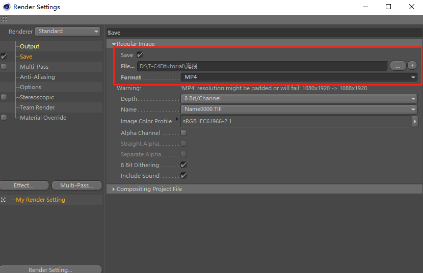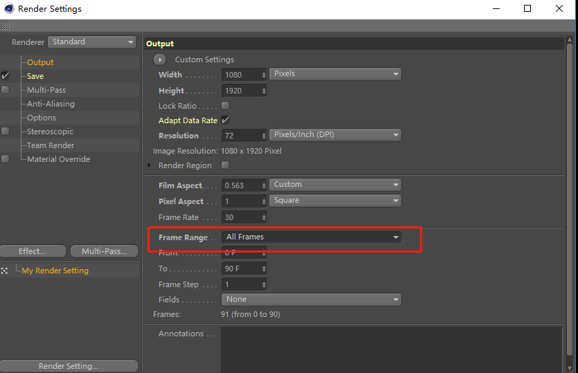 点击渲染设置,将Frame Range(输出范围)调节为All Frames(所有帧),然后在Save(保存)中设置输出文件的位置,将输出的格式改为MP4。