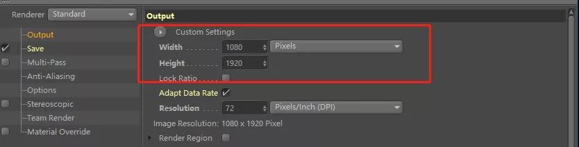 点击渲染设置按钮,在output中将分辨率设置为1080x1920(竖构图)。