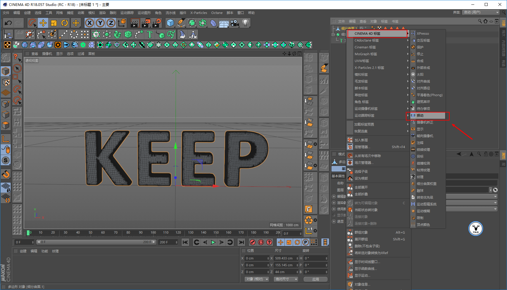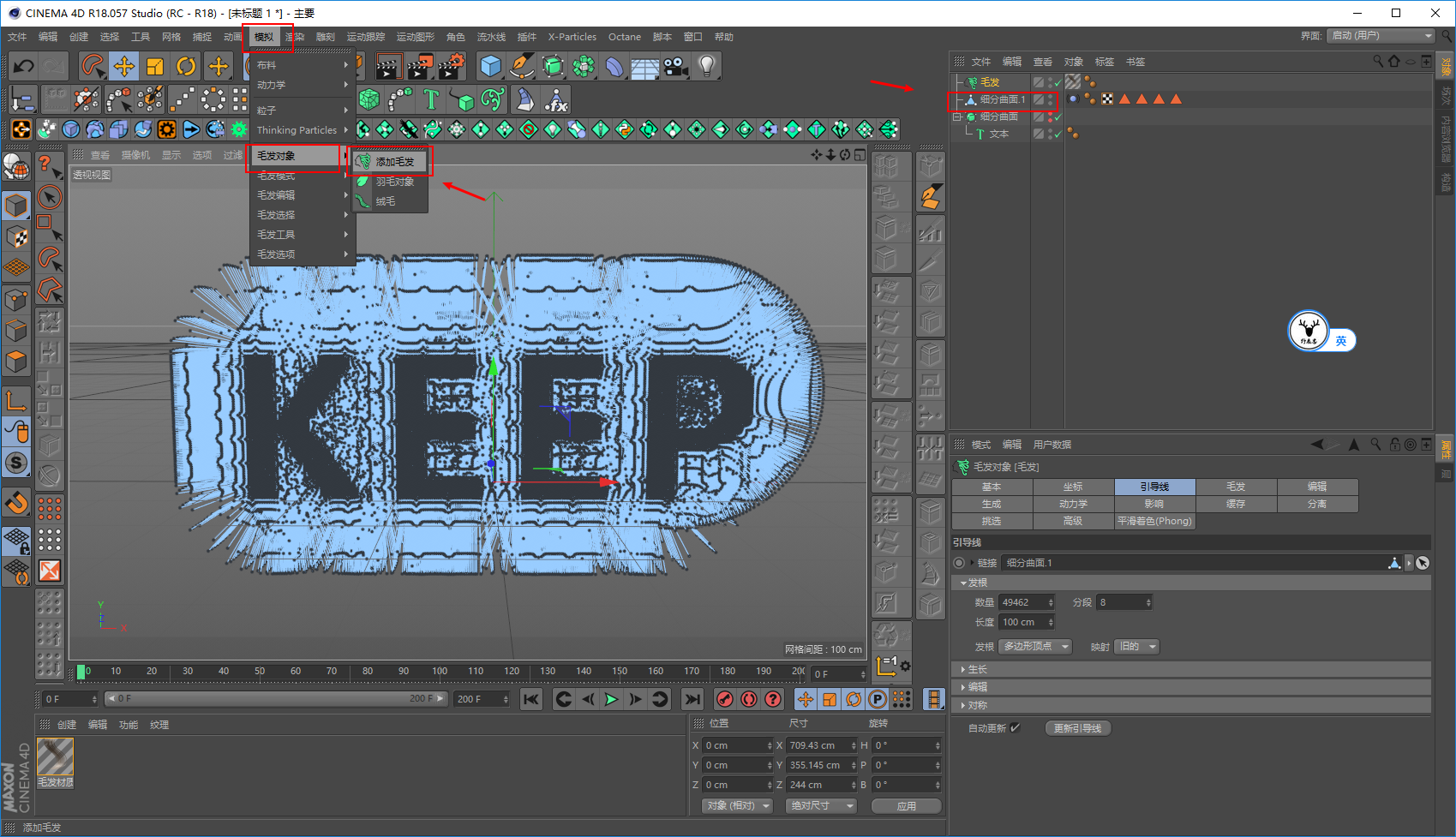 晃动的动画做好了以后,就可以添加毛发了,选中对象执行模拟-毛发对象-添加毛发: