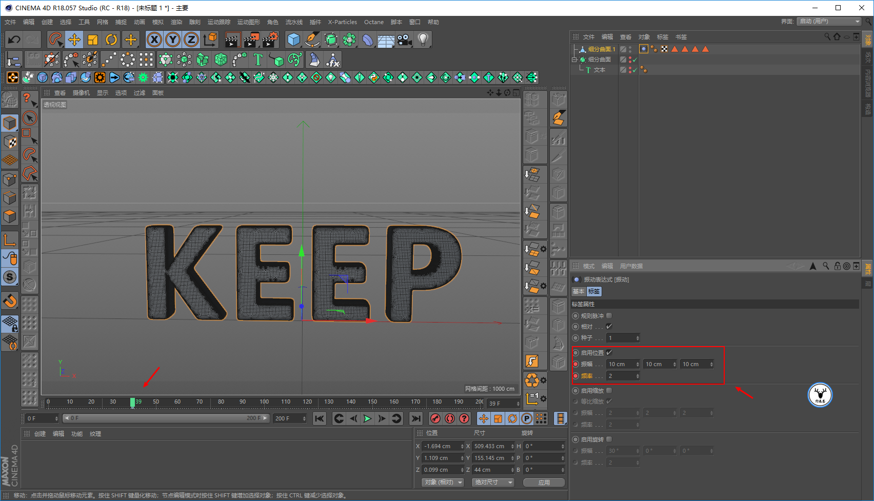勾选启用位置,关键帧的位置大家凭感觉来吧,我这里是在39帧以前,让振动的位移为10,频率2: