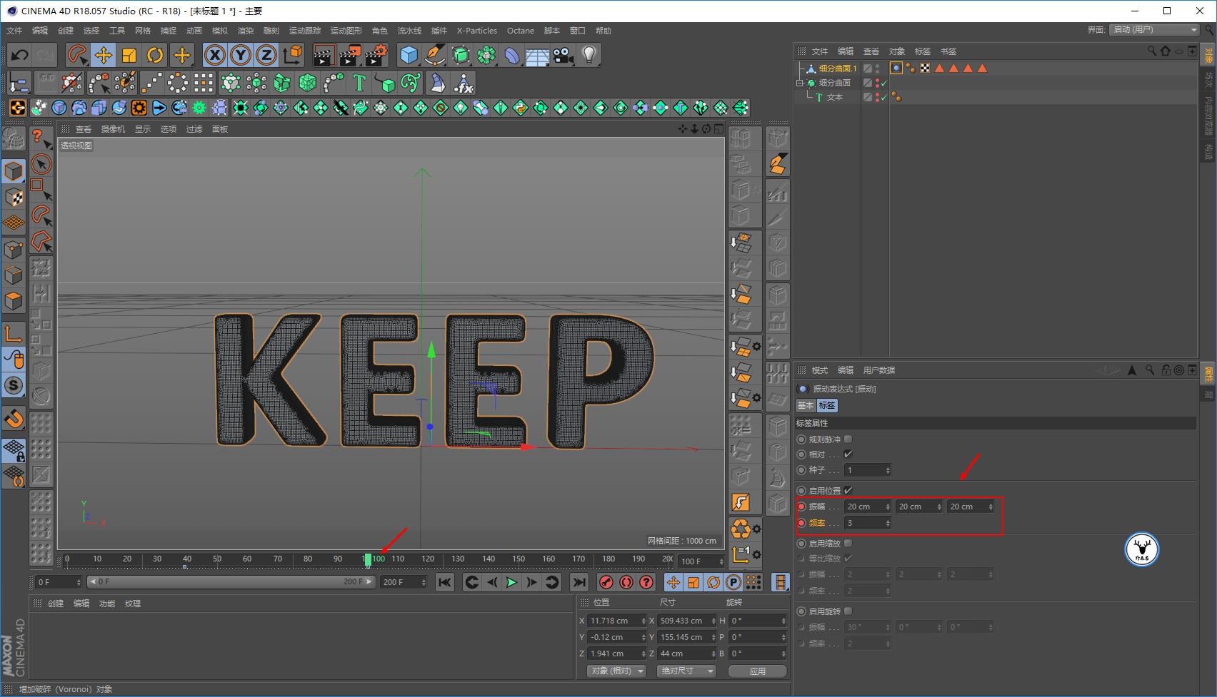 到100帧的时候,让位移变成20,频率3: