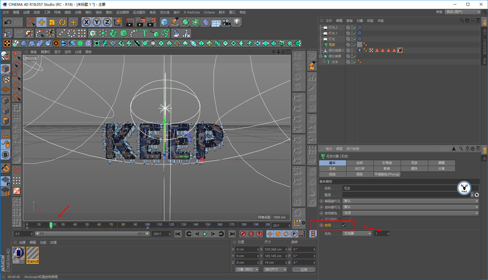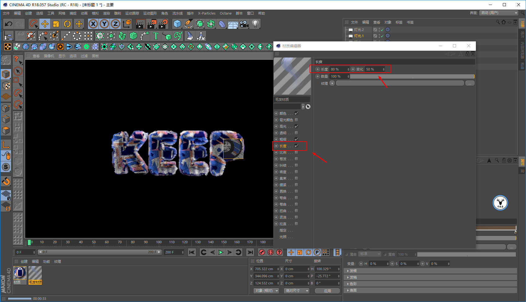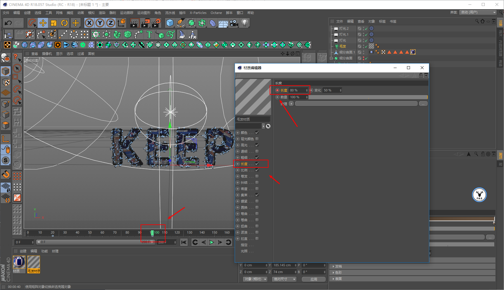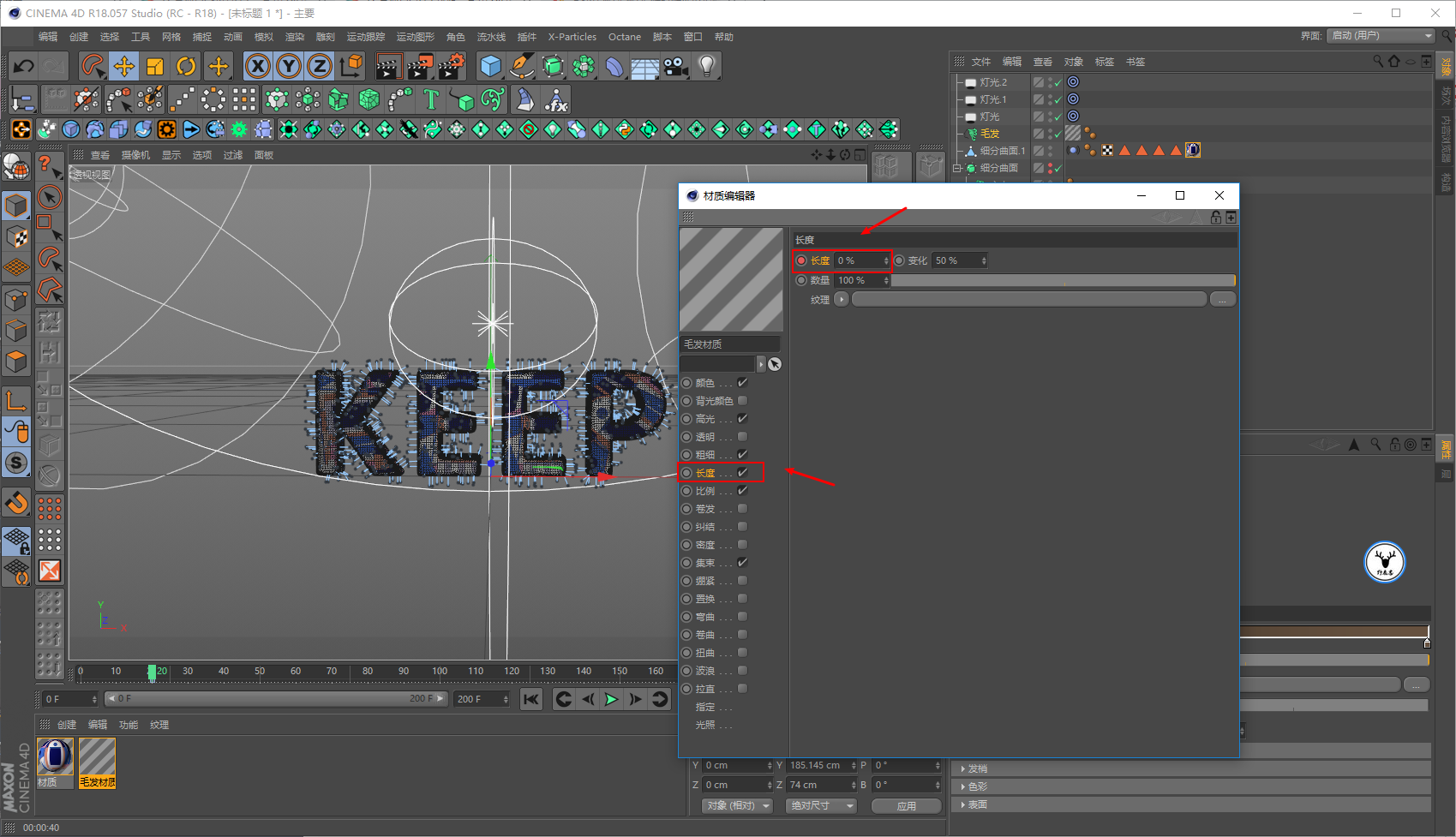 毛发材质里,我们让文字一开始没有毛发,所以长度大概在20帧的样子为0打上关键帧: