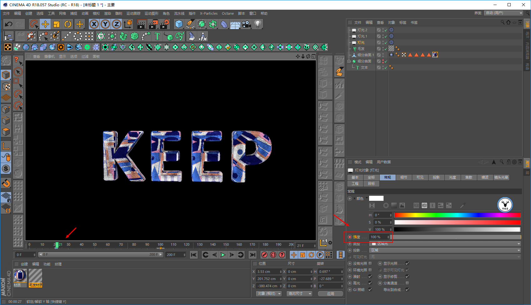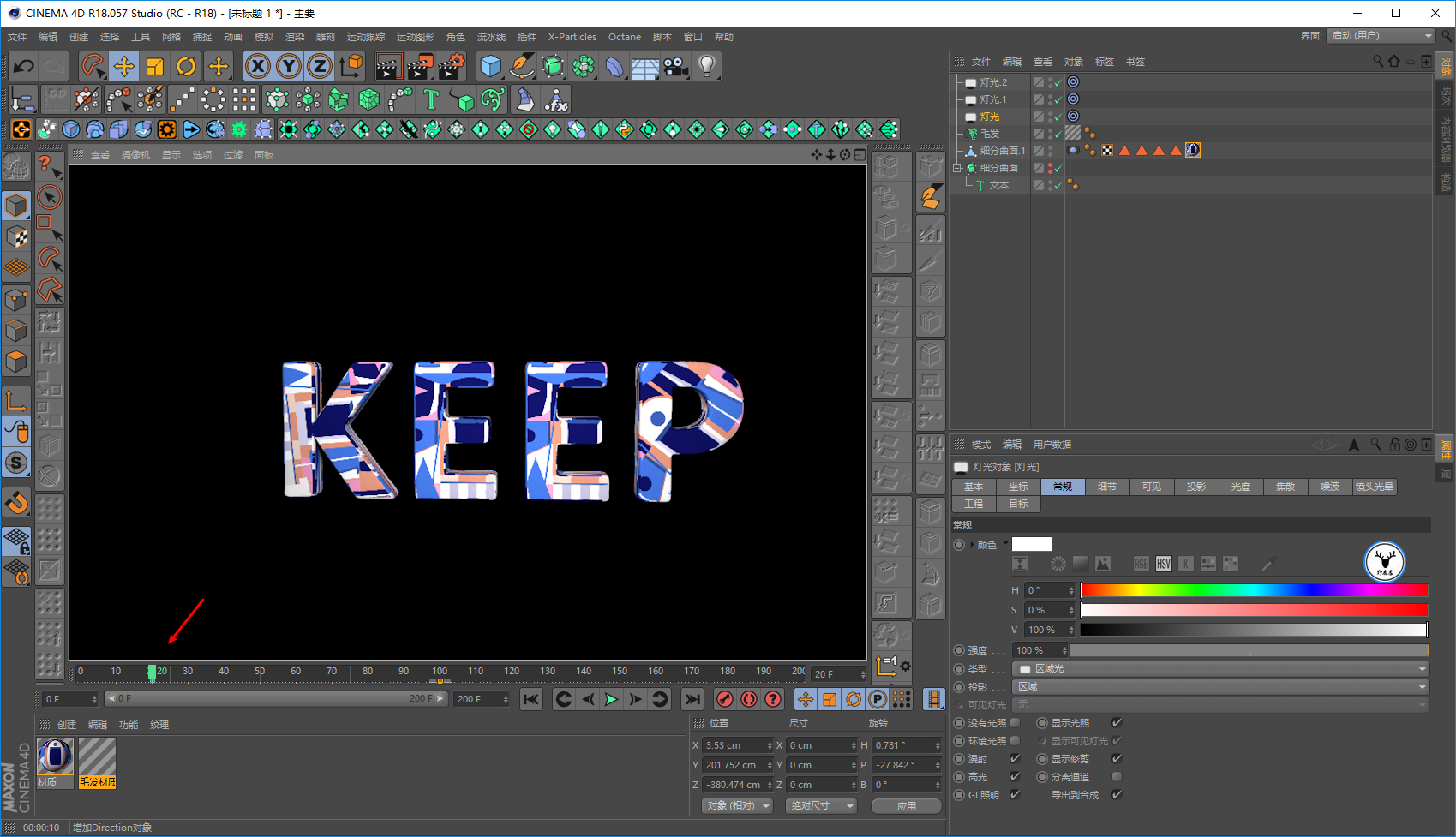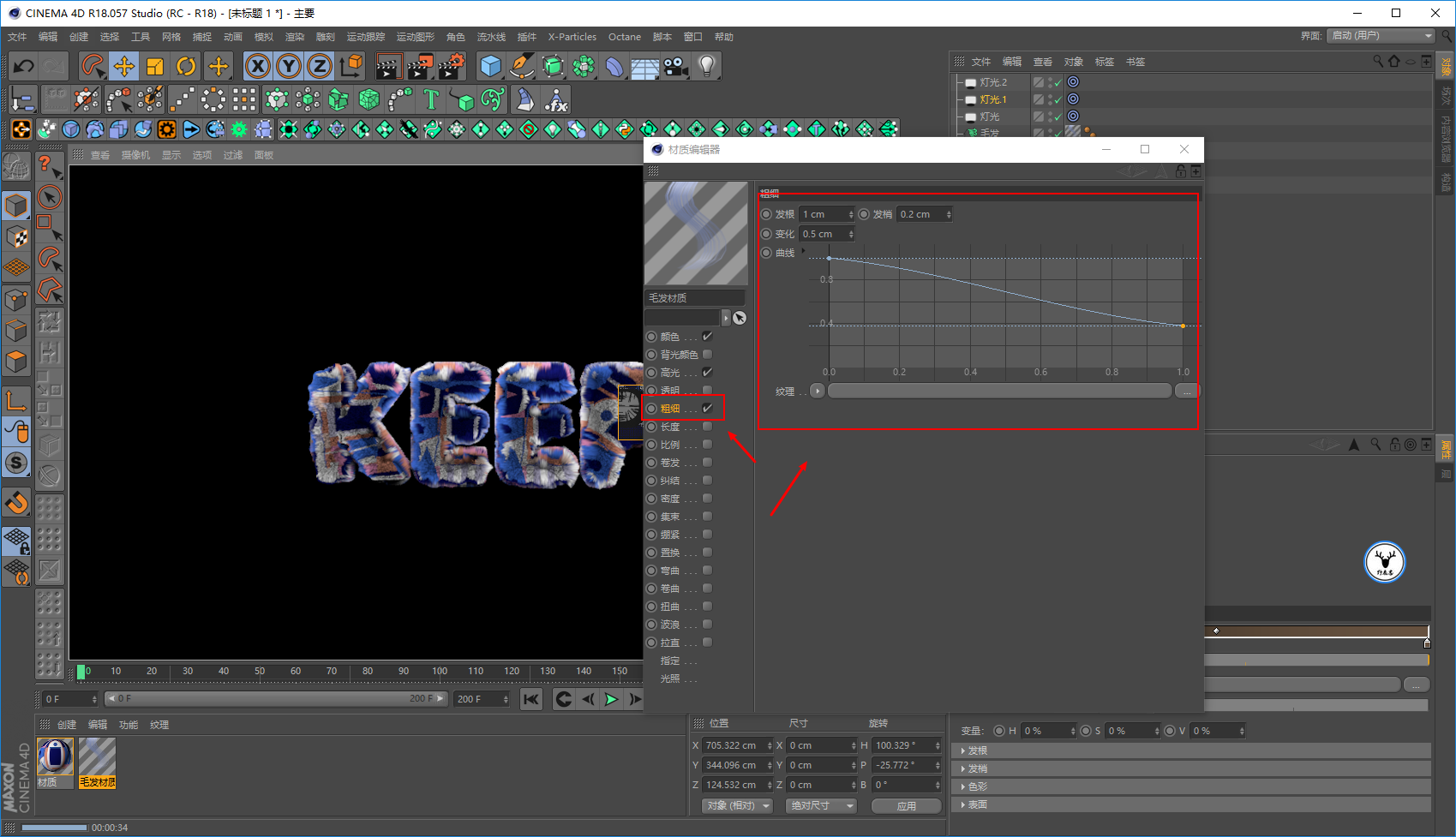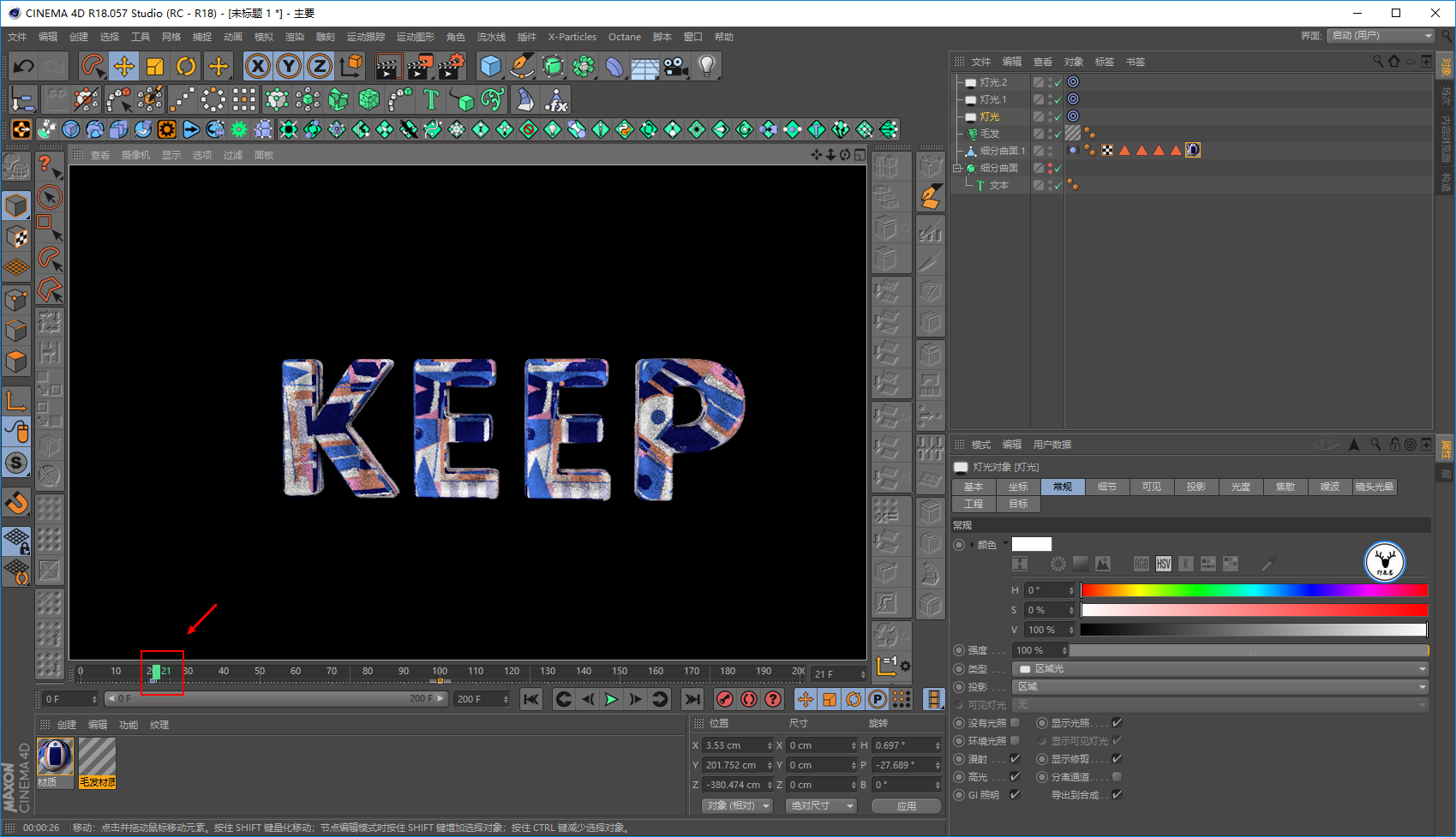 毛发材质里,我们让文字一开始没有毛发,所以长度大概在20帧的样子为0打上关键帧: