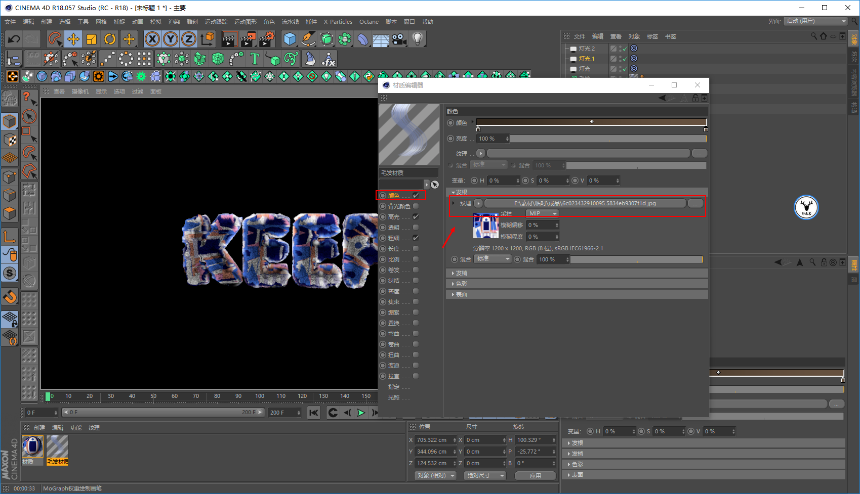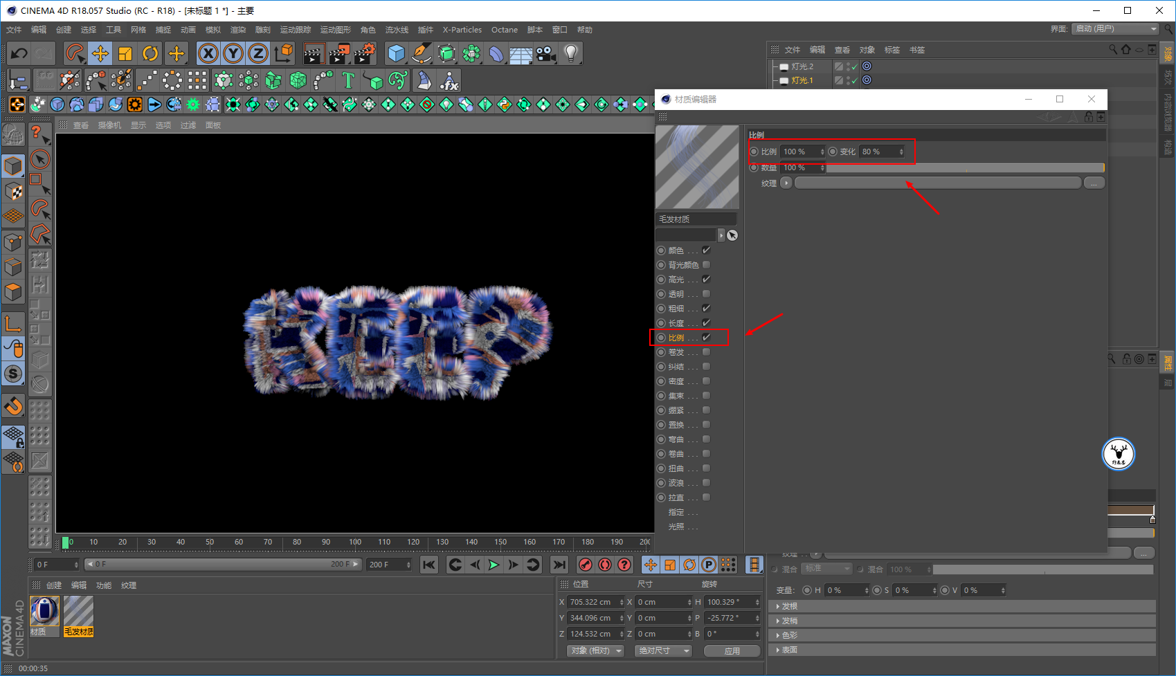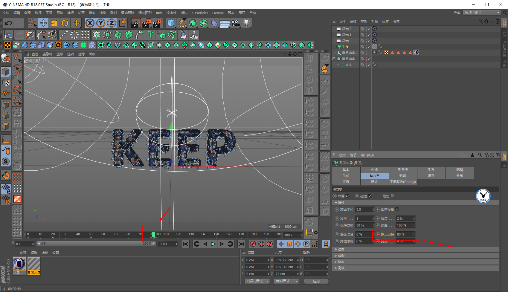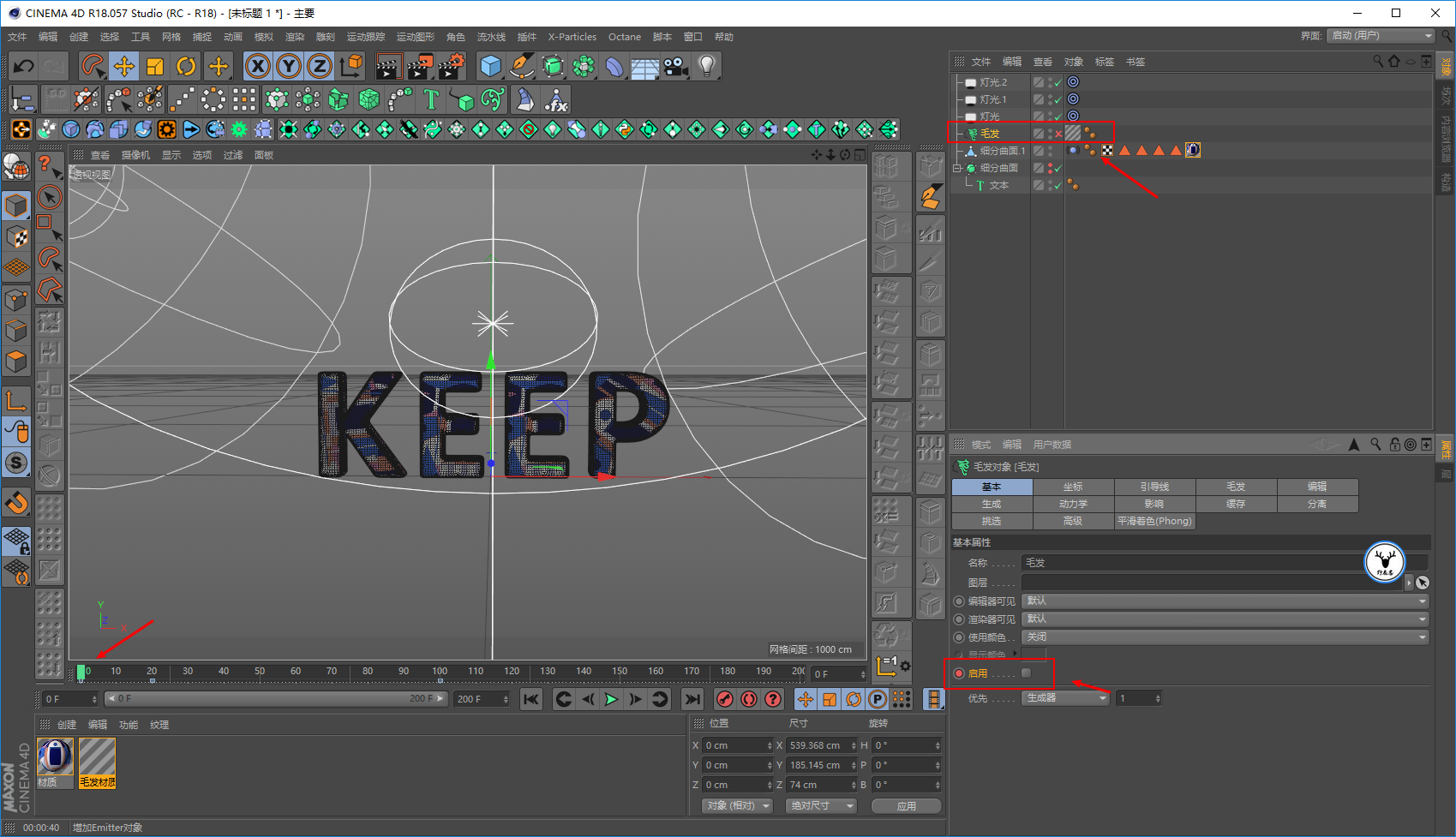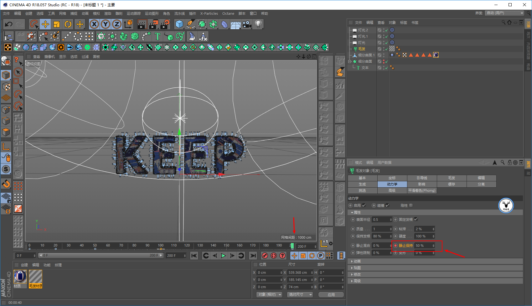 毛发材质里,我们让文字一开始没有毛发,所以长度大概在20帧的样子为0打上关键帧: