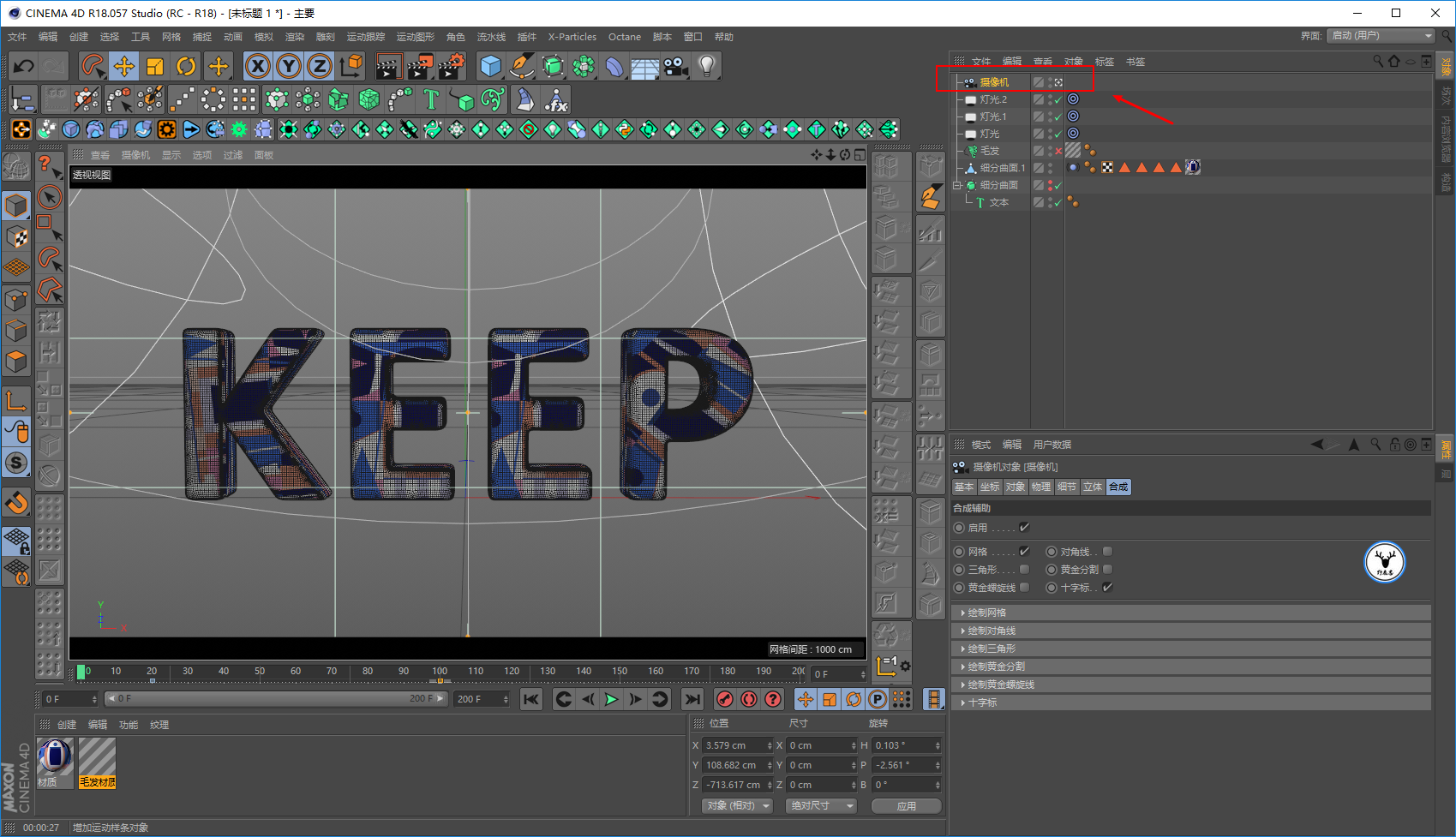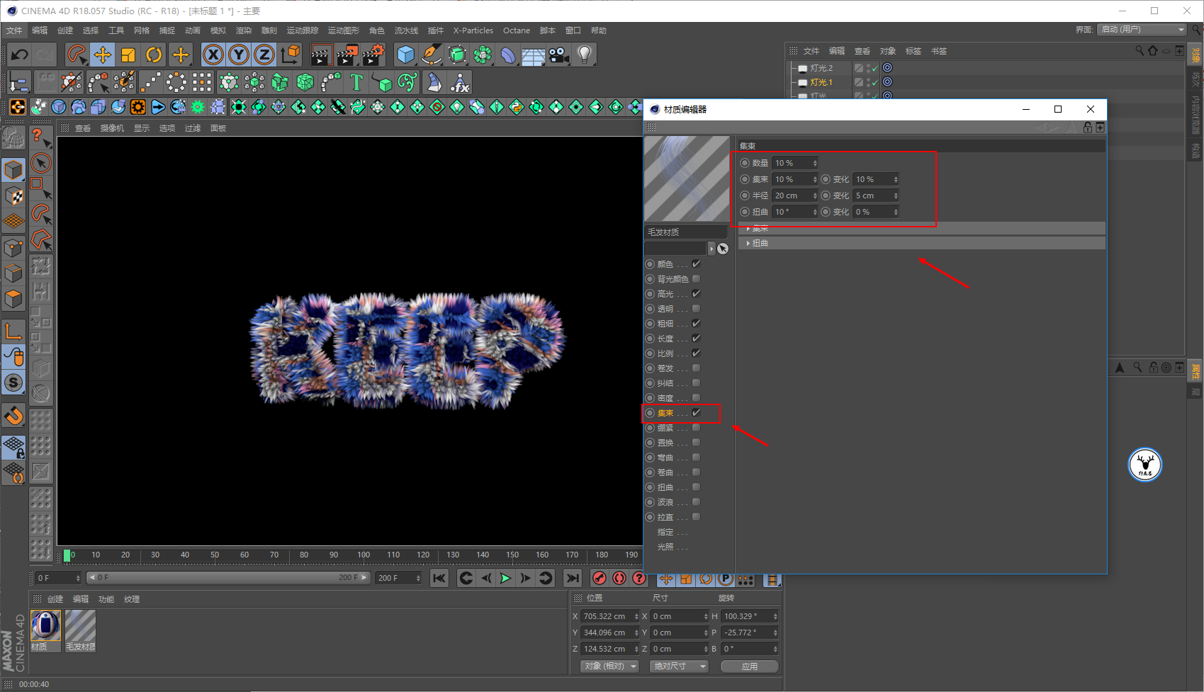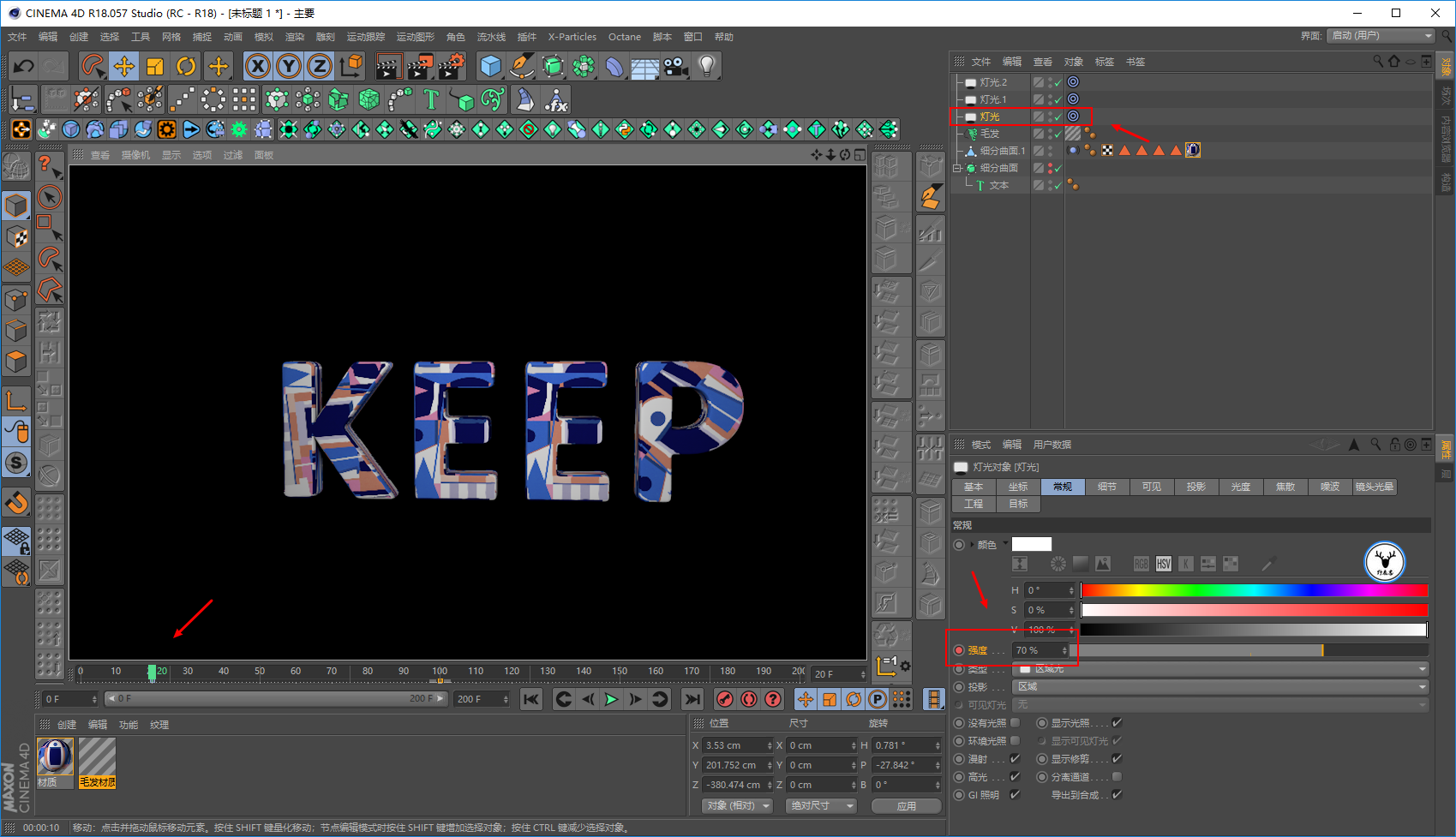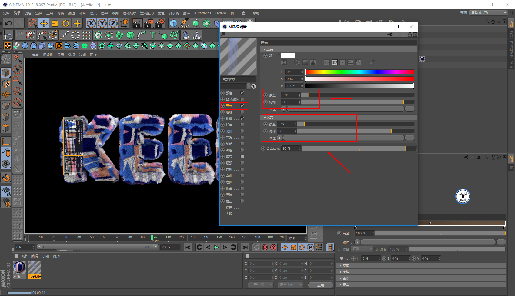 毛发材质里,我们让文字一开始没有毛发,所以长度大概在20帧的样子为0打上关键帧:
