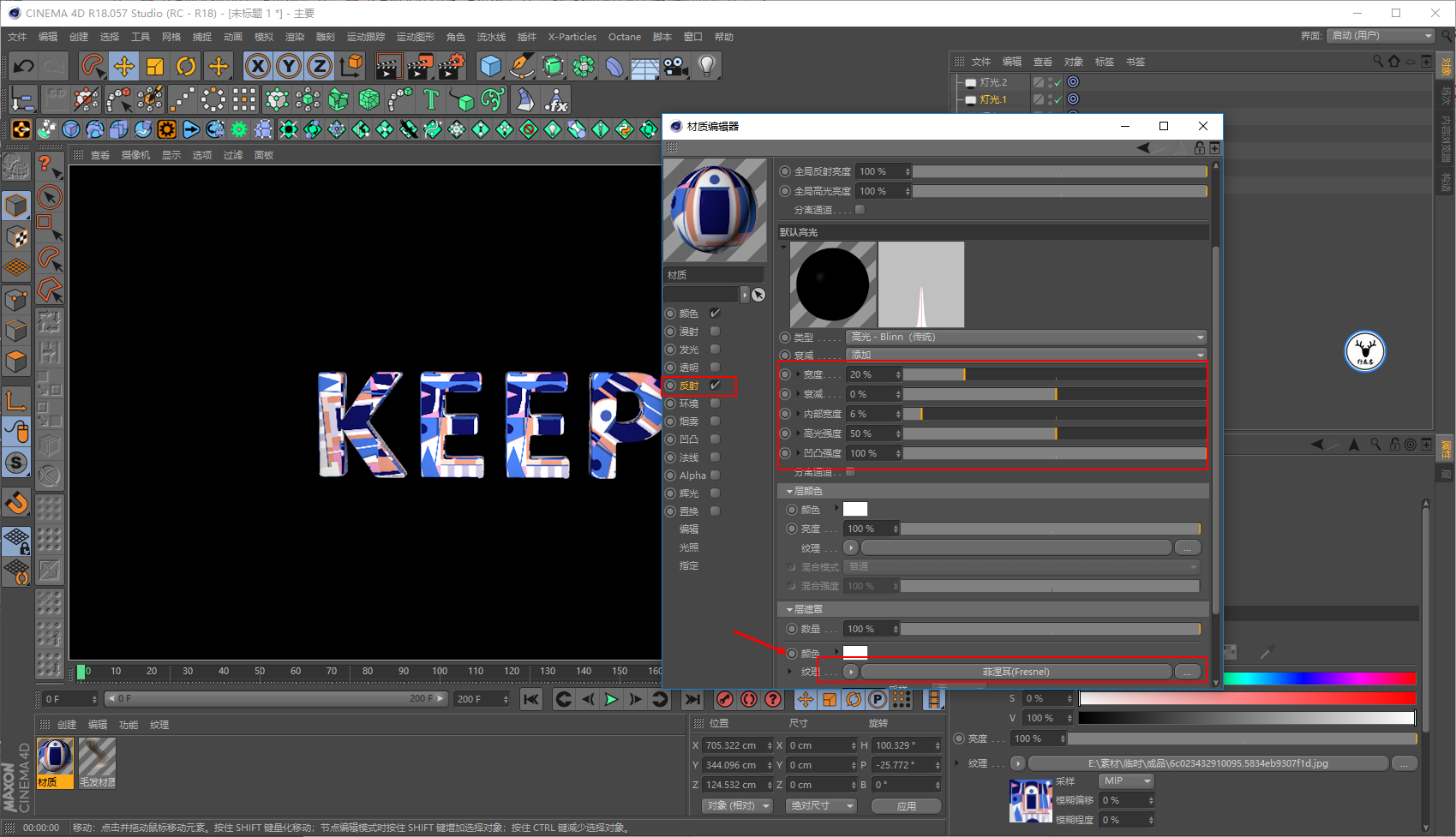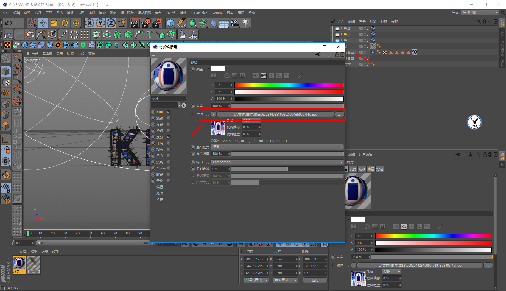 上材质吧,新建材质球拖给文字,在颜色通道中加载一张贴图: